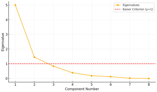 The eigenvalue analysis, supported by the scree plot, indicated that a two-component solution provided the best fit. The first component accounted for 62.57% of the total variance, with an eigenvalue of 5.006; in comparison, the second component accounted for an additional 18.12% with an eigenvalue of 1.450. The two extracted factors together explained 80.69% of the total variance. The rotation sums of squared loadings validated the two-factor structure by showing distinct yet related factors between construction emissions and socioeconomic factors (see Figure 2 and Table 4). The Kaiser criterion selects components with eigenvalues greater than one. The evaluation of borderline components included a tolerance range from 0.95 to 1.05 to address both sampling variations and rounding errors. The method provided stable factor retention while preventing excessive factor extraction.