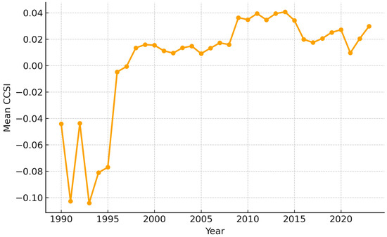The construction supply chain has continued to emit high levels of greenhouse gas emissions because technological advancements in extraction and consumption volumes have failed to keep pace with the rapid growth in these areas. The same emission patterns have been observed in multiple industrial sectors that show rising absolute emissions despite achieving higher operational efficiency [51,52,53,54]. Furthermore, the global mean CCSI shows minimal change during the 33-year period because construction sector decarbonization efforts have resulted in limited overall progress despite technological progress and rising climate awareness. The minimal change in global mean CCSI for 33 years shows that the construction sector has failed to decouple its carbon emissions because local efficiency improvements have not led to a global decrease in construction emissions. The construction sector’s emission reductions in developed countries have been neutralized by developing nations’ fast-paced urban development and construction activities. The equilibrium effect emerges because OECD and G20 countries’ efficiency improvements, material substitutions, and policy-driven progress are matched by rising construction energy and carbon usage in developing economies. The findings of this study demonstrate that worldwide construction sector decarbonization efforts show uneven progress because local initiatives fail to create a global shift in construction material use and process methods.