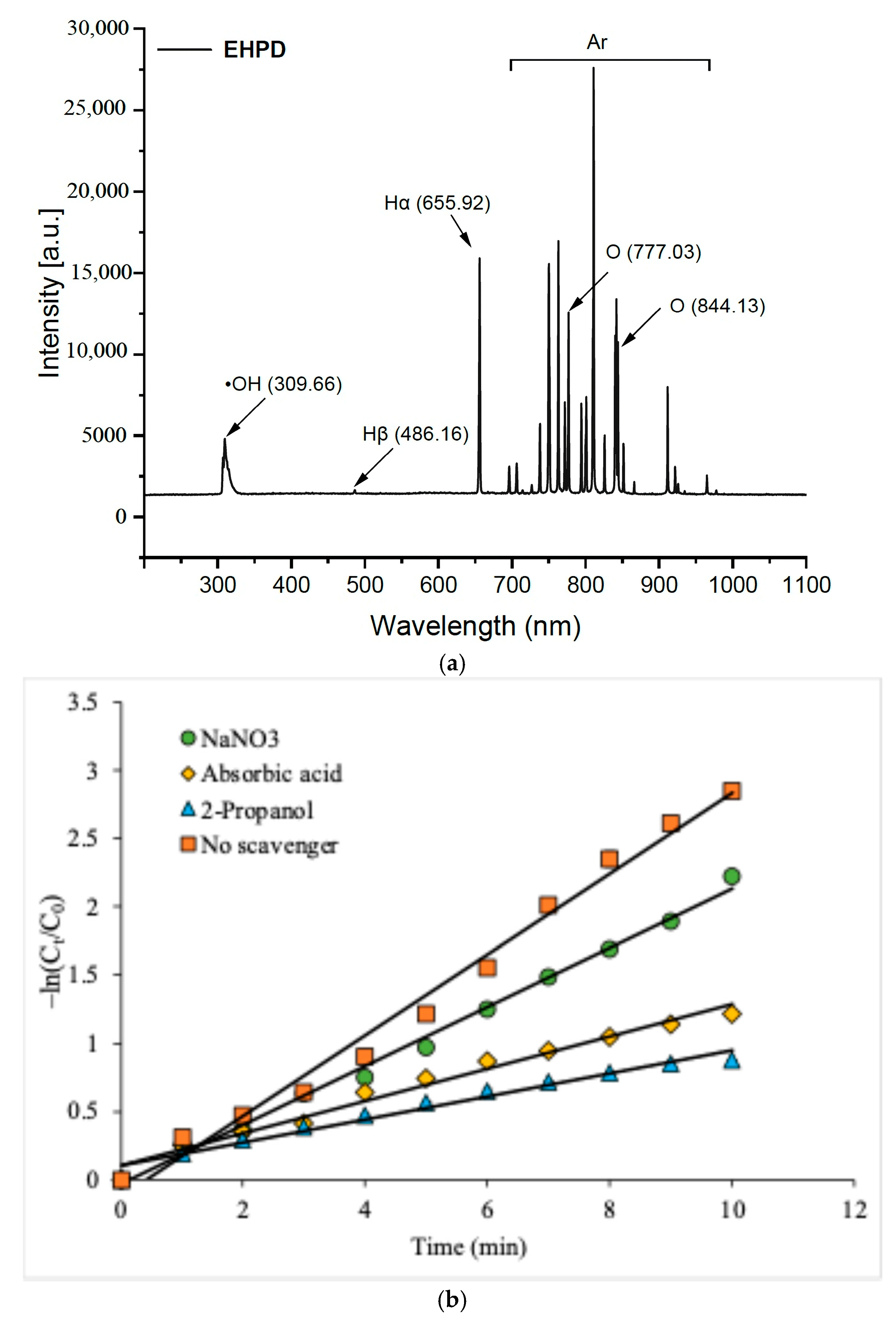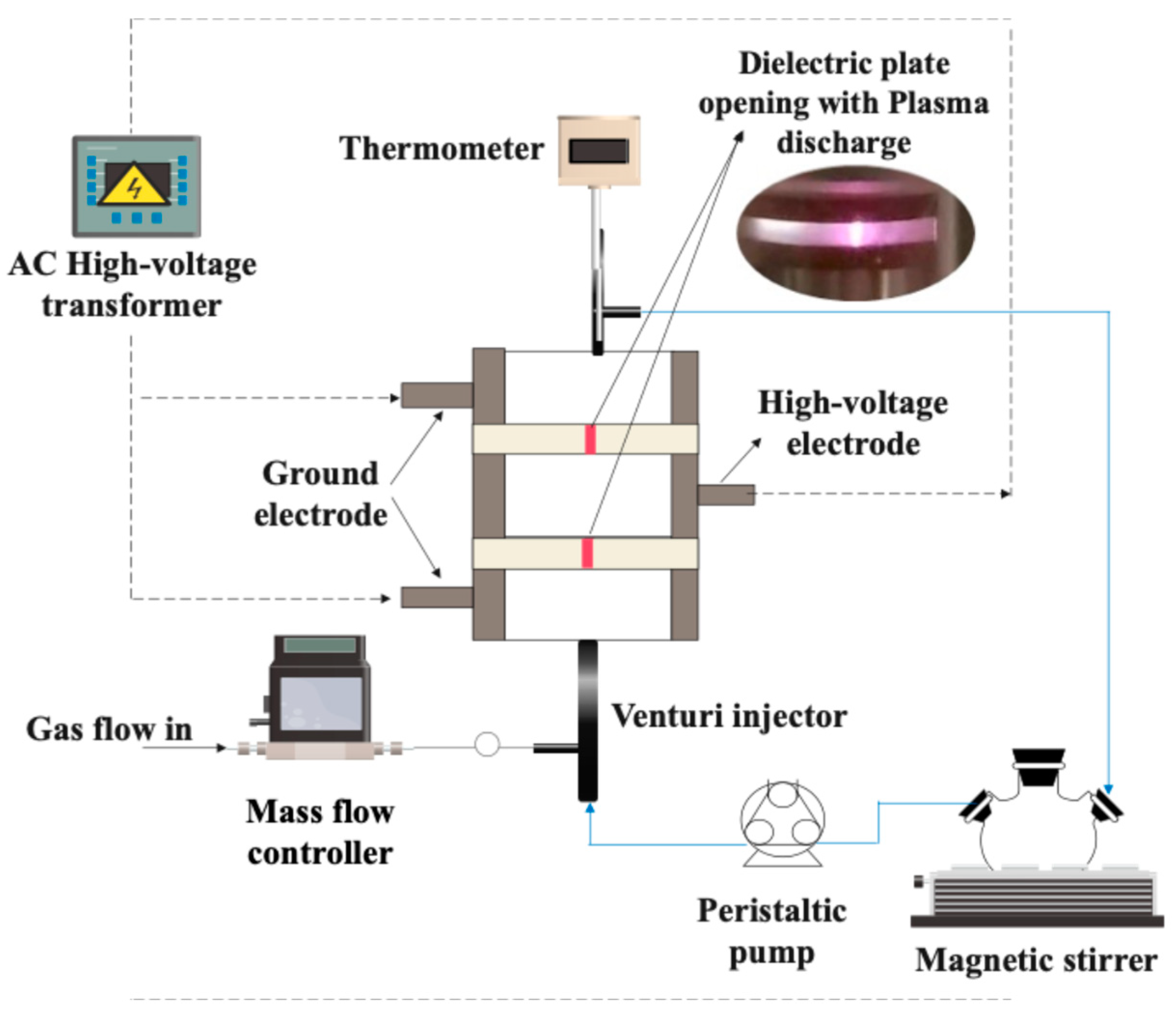 - Khourshidi, A.; Ajam, F.; Rabieian, M.; Taghavijeloudar, M. Efficient degradation of p-nitrophenol from water by enhancing dielectric barrier discharge (DBD) plasma through ozone circulation: Optimization, kinetics and mechanism. Chemosphere 2024, 362, 142749. [Google Scholar] [CrossRef]
