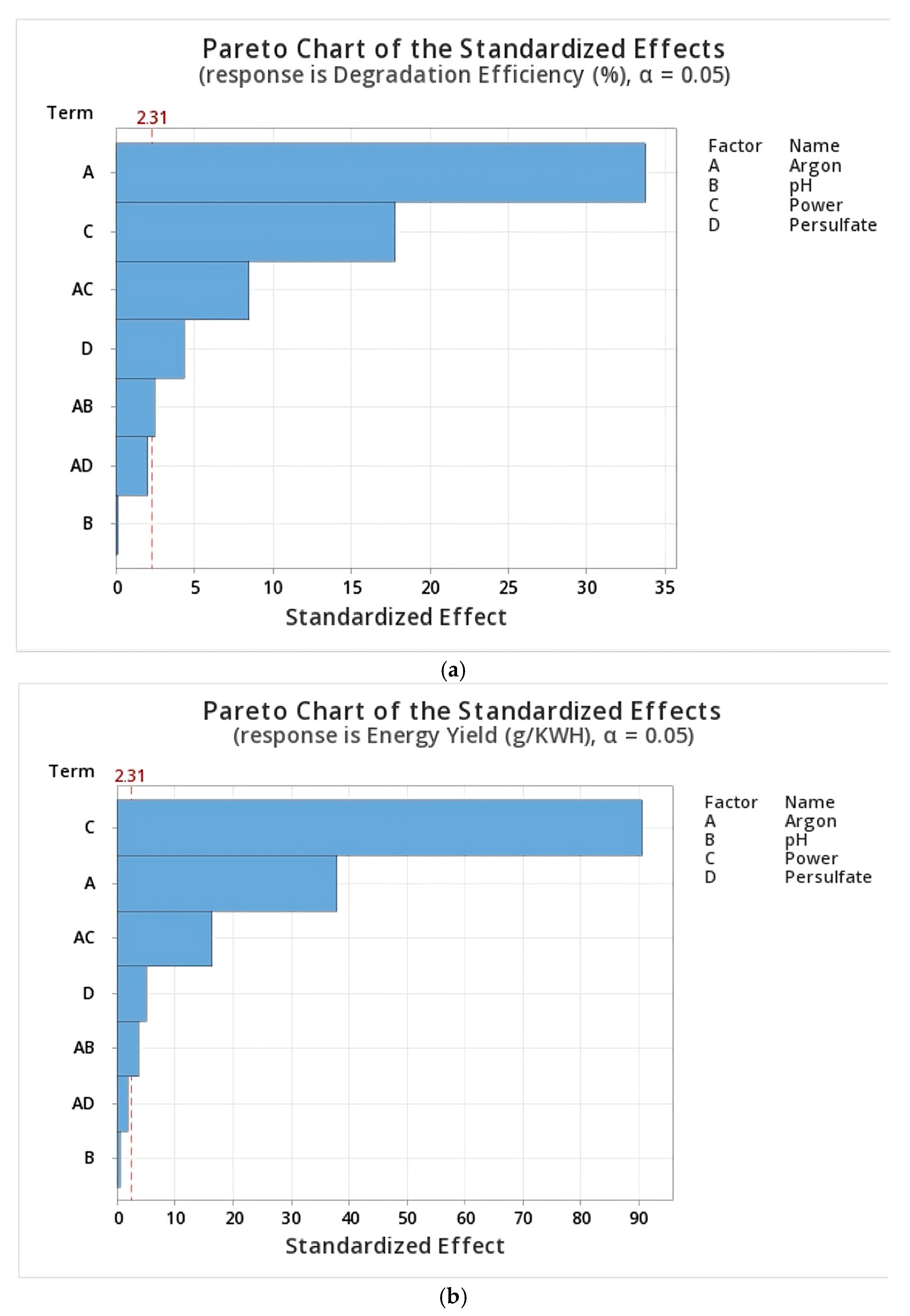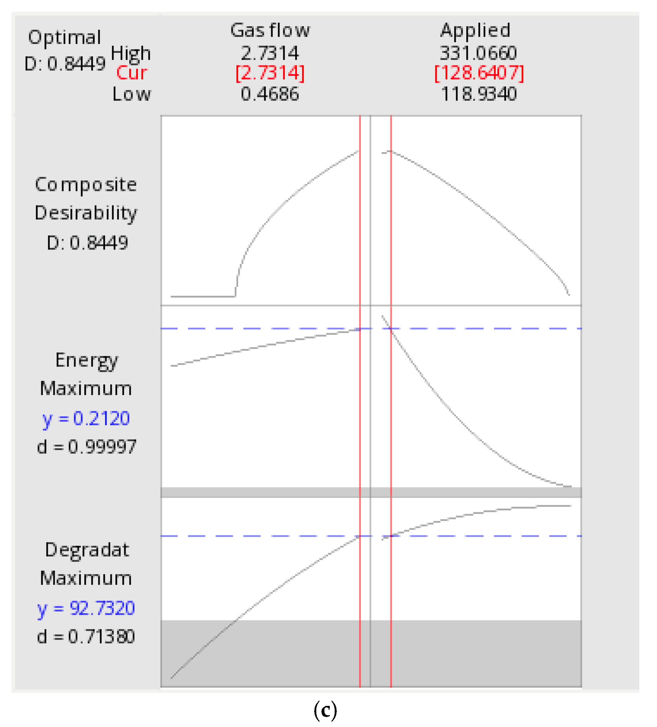 Energy yield (g/kWh) | = | 0.33639 + 0.02638 Argon − 0.001578 Power −0.00152 Argon × Argon + 0.000002 Power × Power −0.000067 Argon × Power | (6) |