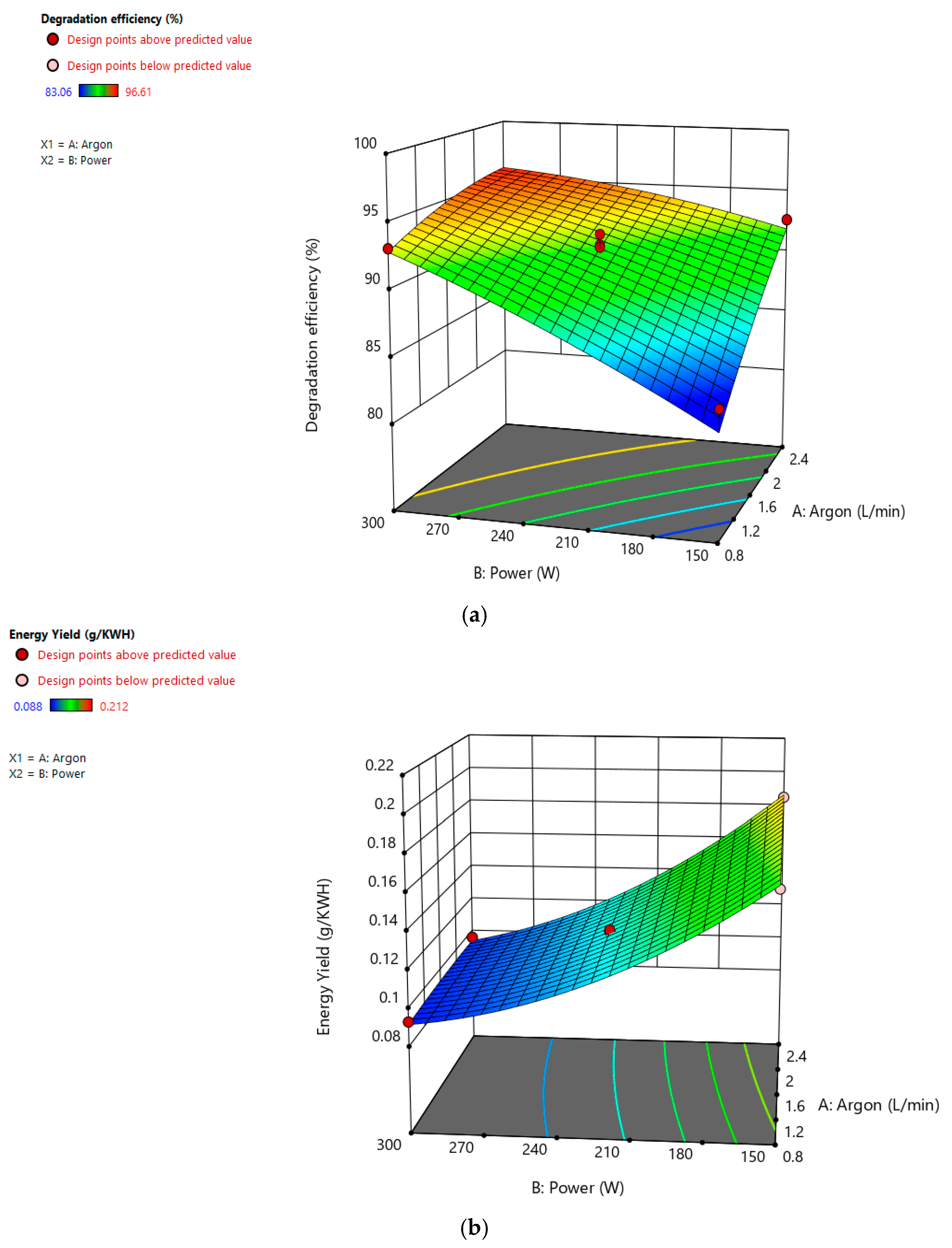 Degradation efficiency (%) | = | 54.85 + 14.01 Argon + 0.1449 Power −0.900 Argon × Argon- 0.000098 Power × Power −0.0304 Argon × Power | (5) |