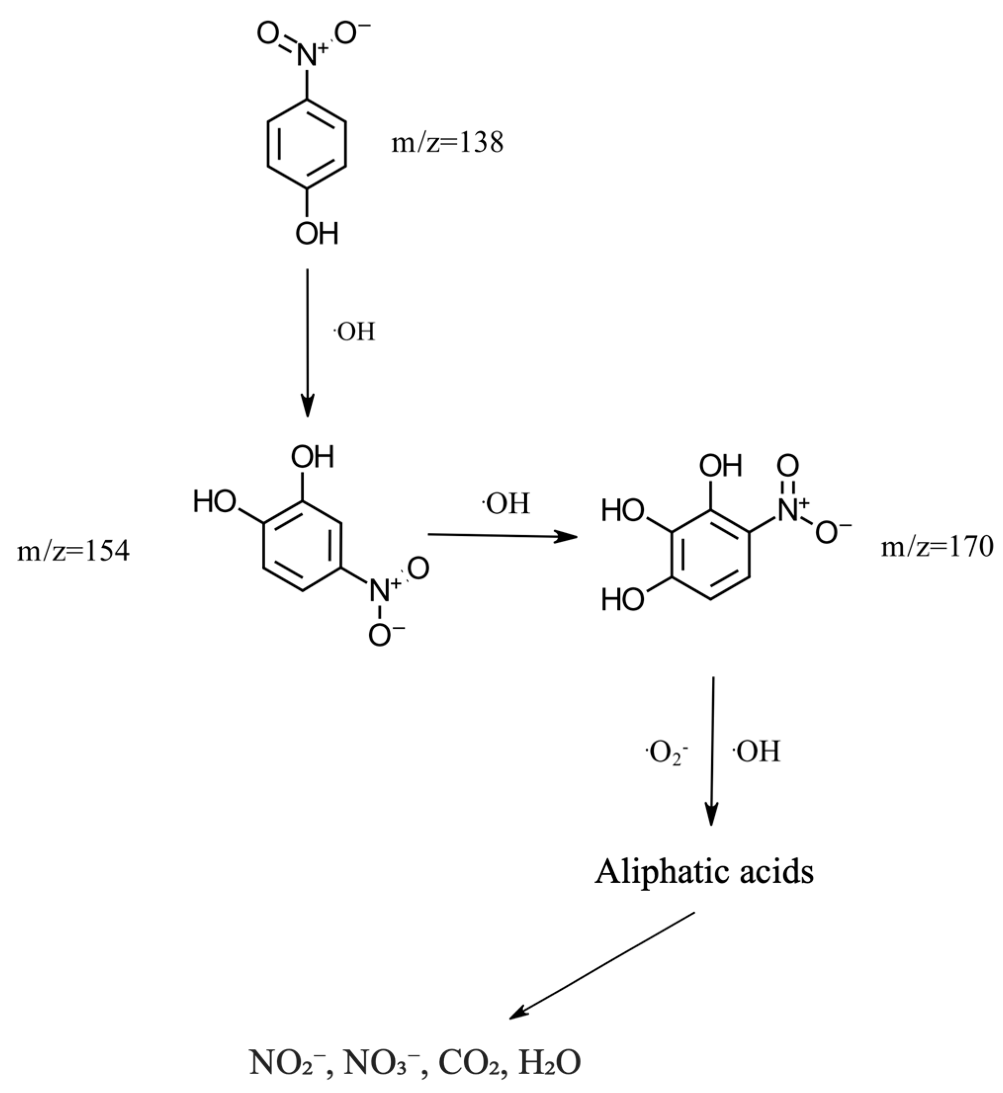 - Wang, N.; Lv, G.; He, L.; Sun, X. New insight into photodegradation mechanisms, kinetics and health effects of p-nitrophenol by ozonation in polluted water. J. Hazard. Mater. 2021, 403, 123805. [Google Scholar] [CrossRef]