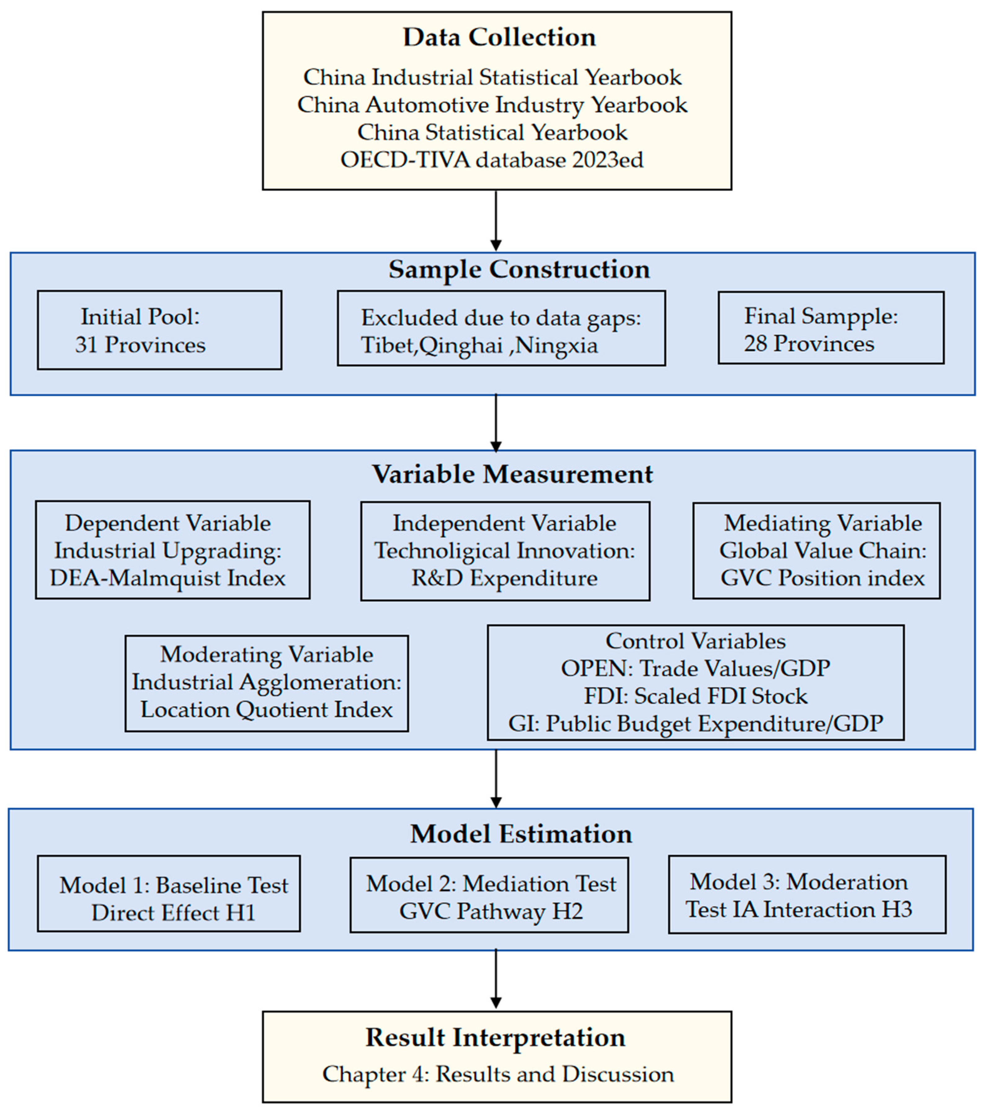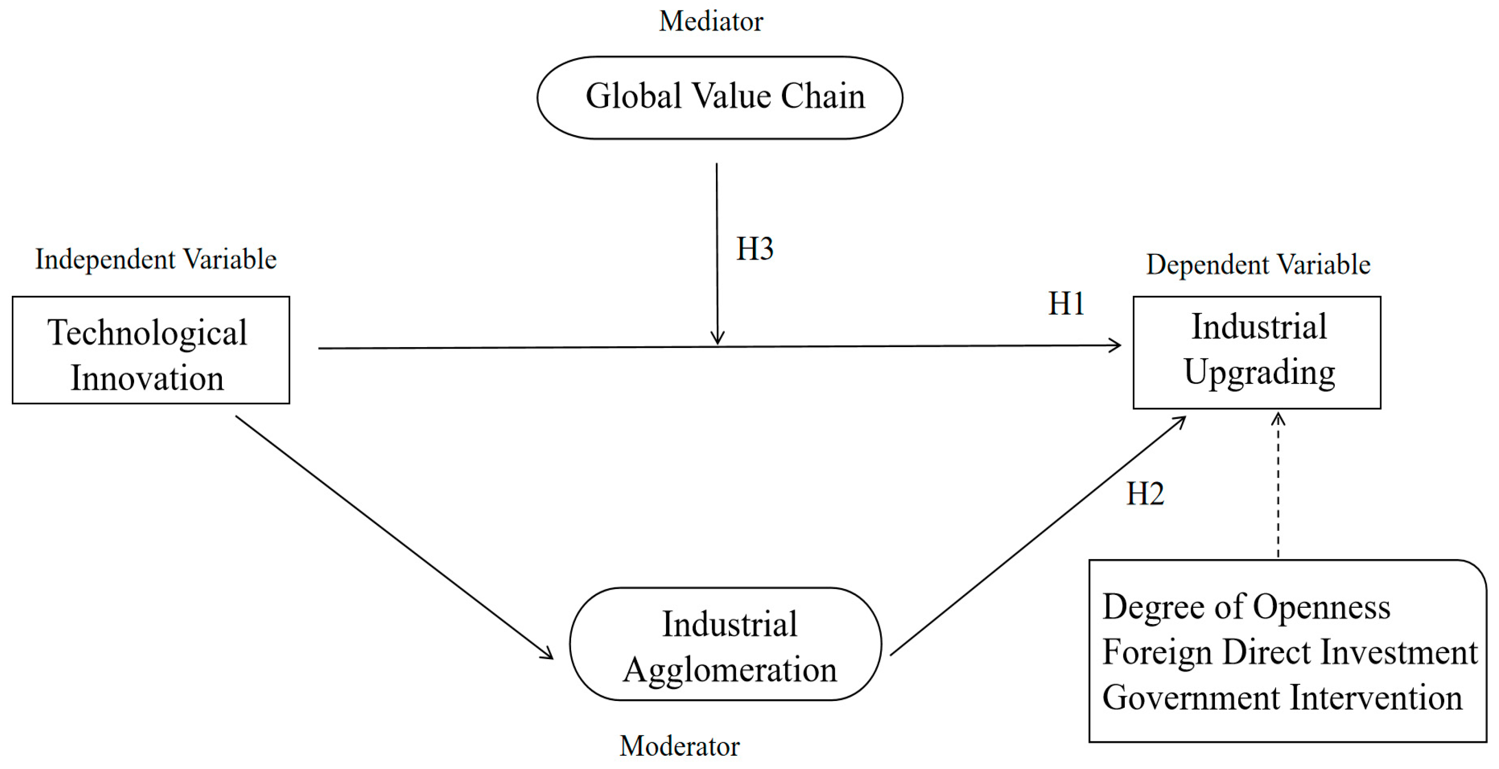 Existing research on industrial upgrading primarily emphasizes the direct effects of technological innovation on economic growth and industrial upgrading. However, studies on how technological innovation shapes industrial upgrading via the mediating mechanism of GVCs remain relatively scarce. Furthermore, the moderating effects of industrial agglomeration, a significant characteristic of regional economies, on the relationship between technological innovation and industrial upgrading have been largely underexplored in current scholarship. To fill these gaps, this research seeks to investigate several core questions: Can technological innovation directly promote industrial upgrading in China’s automotive industry? Does technological innovation indirectly facilitate industrial upgrading in China’s automotive industry through the mediating mechanism of the GVC? Additionally, does industrial agglomeration exert a moderating effect on the pathway through which technological innovation influences industrial upgrading in this sector?