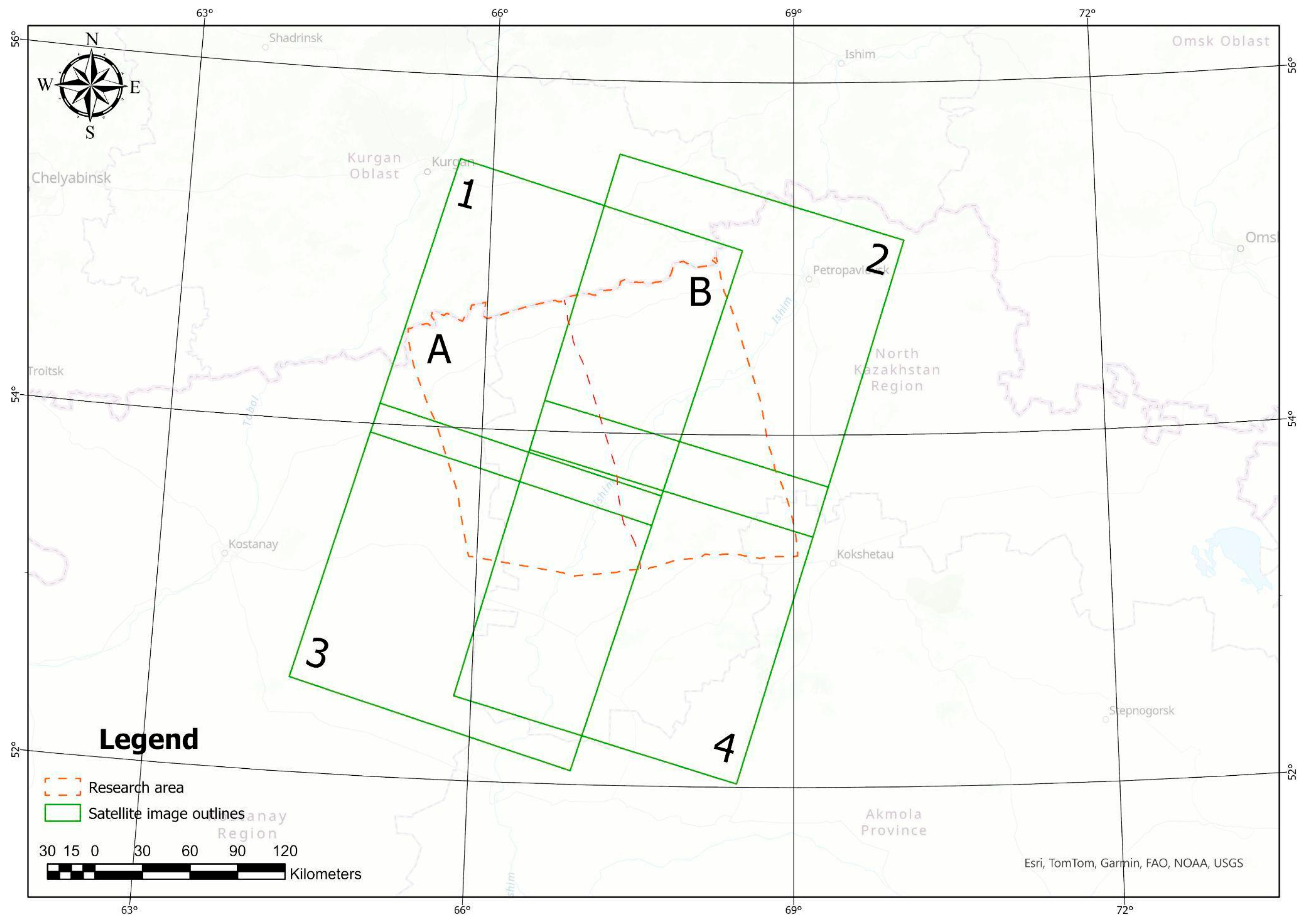 - Kraemer, R.; Prishchepov, A.V.; Müller, D.; Kuemmerle, T.; Radeloff, V.C.; Dara, A.; Terekhov, A.; Frühauf, M. Long-term agricultural land-cover change and potential for cropland expansion in the former Virgin Lands area of Kazakhstan. Environ. Res. Lett. 2015, 10, 054012. [Google Scholar] [CrossRef]