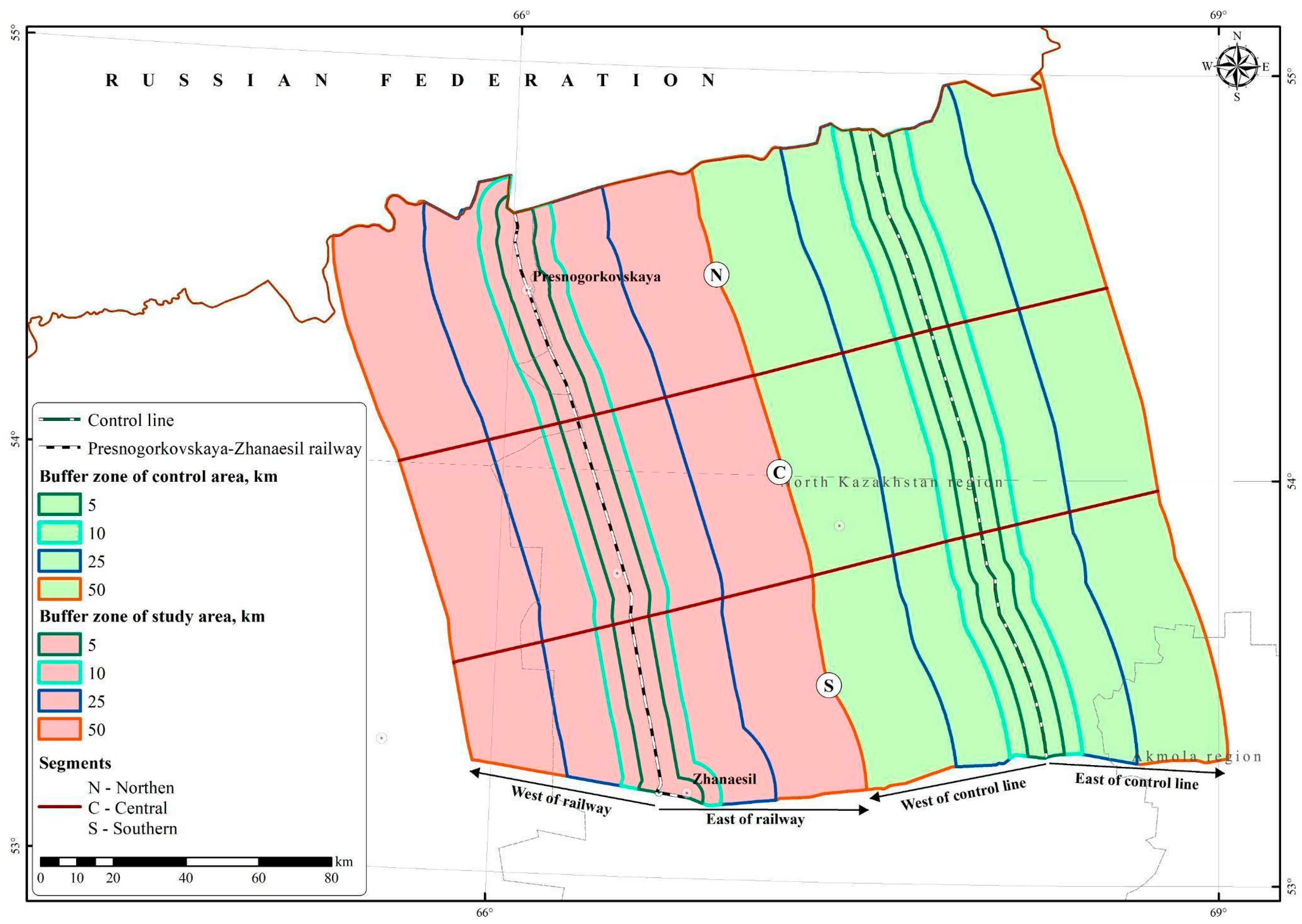 - Bizhanova, N.; Grachev, A.; Rametov, N.; Baidavletov, Y.; Saparbayev, S.; Bespalov, M.; Bespalov, S.; Kumayeva, I.; Toishibekov, Y.; Khamchukova, A.; et al. Railway and Road Infrastructure in Saiga Antelope Range in Kazakhstan. Diversity 2025, 17, 431. [Google Scholar] [CrossRef]