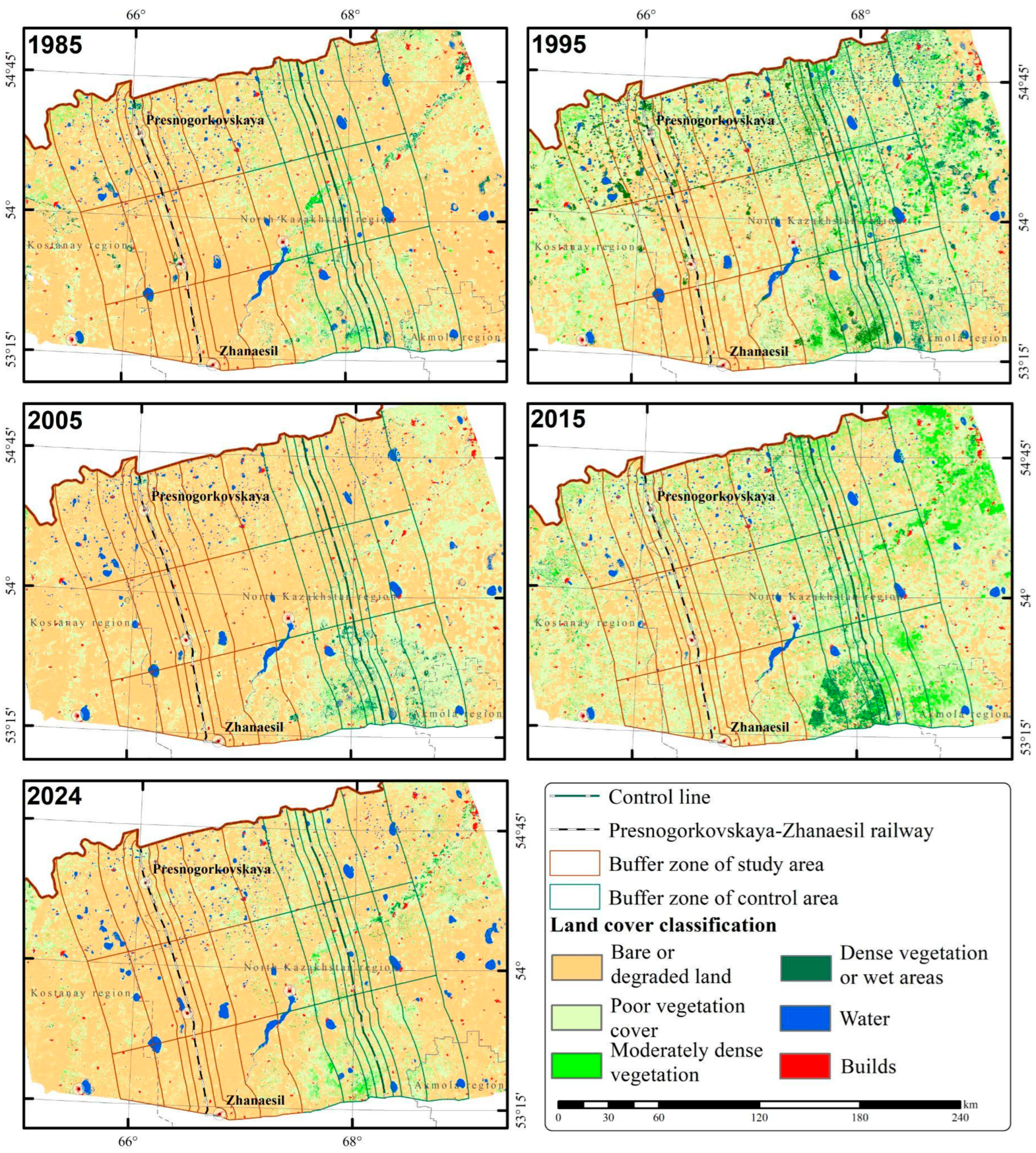 Ashimova, B.; Beisenova, R.; Menéndez-Pidal, I. Assessing Long-Term Land-Cover Dynamics Along the Presnogorkovskaya–Zhanaesil Railway Corridor (1985–2024), Kazakhstan: A Landsat NDVI Buffer-Gradient Approach for Sustainable Rail Infrastructure. Sustainability 2025, 17, 9278. https://doi.org/10.3390/su17209278