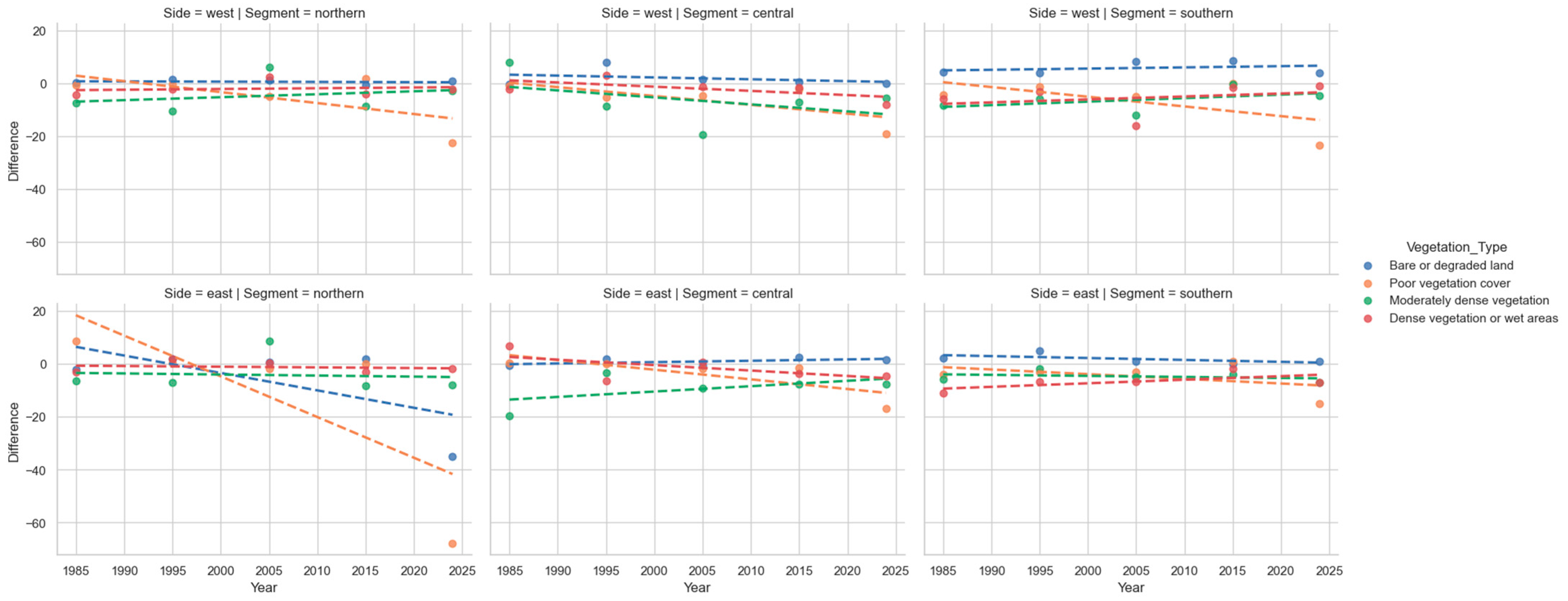 - The landscape along the railway was similarly characterized by the predominance of “Bare or degraded land” and “Poor vegetation cover,” which exhibited a strong inverse relationship, with periods of degradation alternating with phases of recovery.