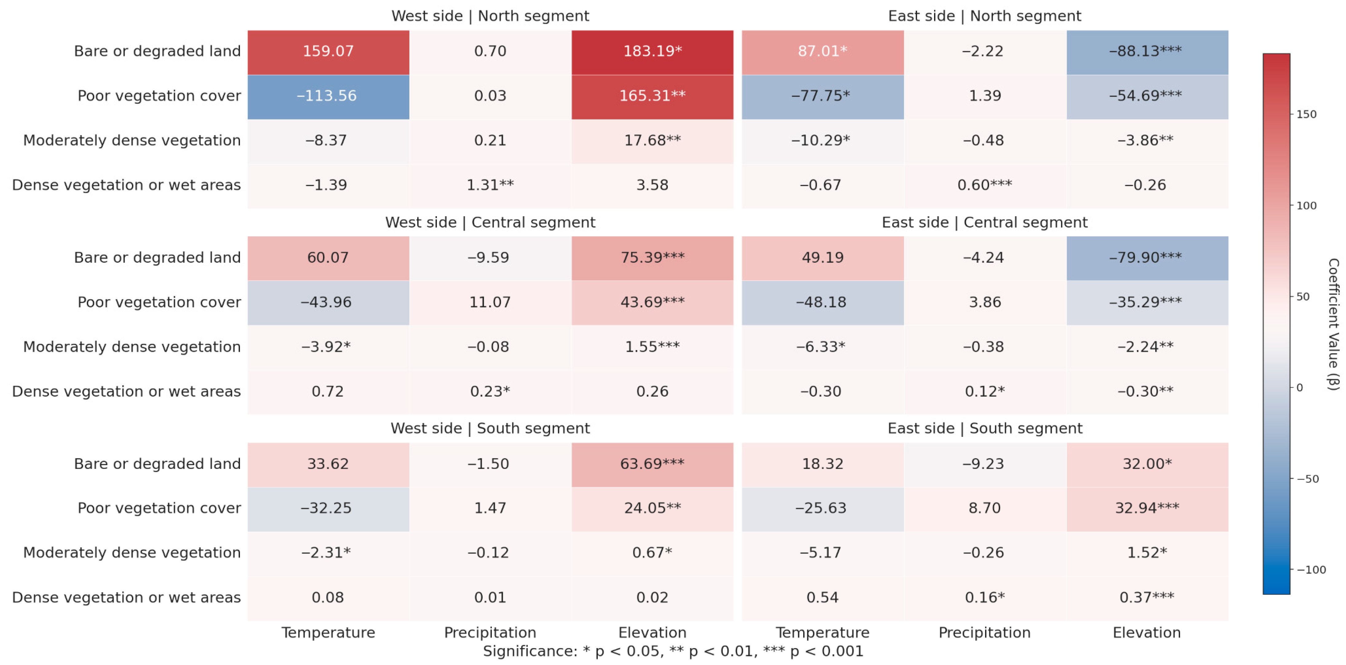 - Comparison of the B coefficient results with multiple regression analysis showed that, despite the positive influence of precipitation on dense vegetation (p < 0.05), this cover type virtually disappeared in the railway’s zone of influence. This indicates that the anthropogenic factor here is so strong that it negates favorable natural conditions. Elevation was identified as the most significant natural predictor, with the effect of relief differing between the western and eastern sides of the corridor.