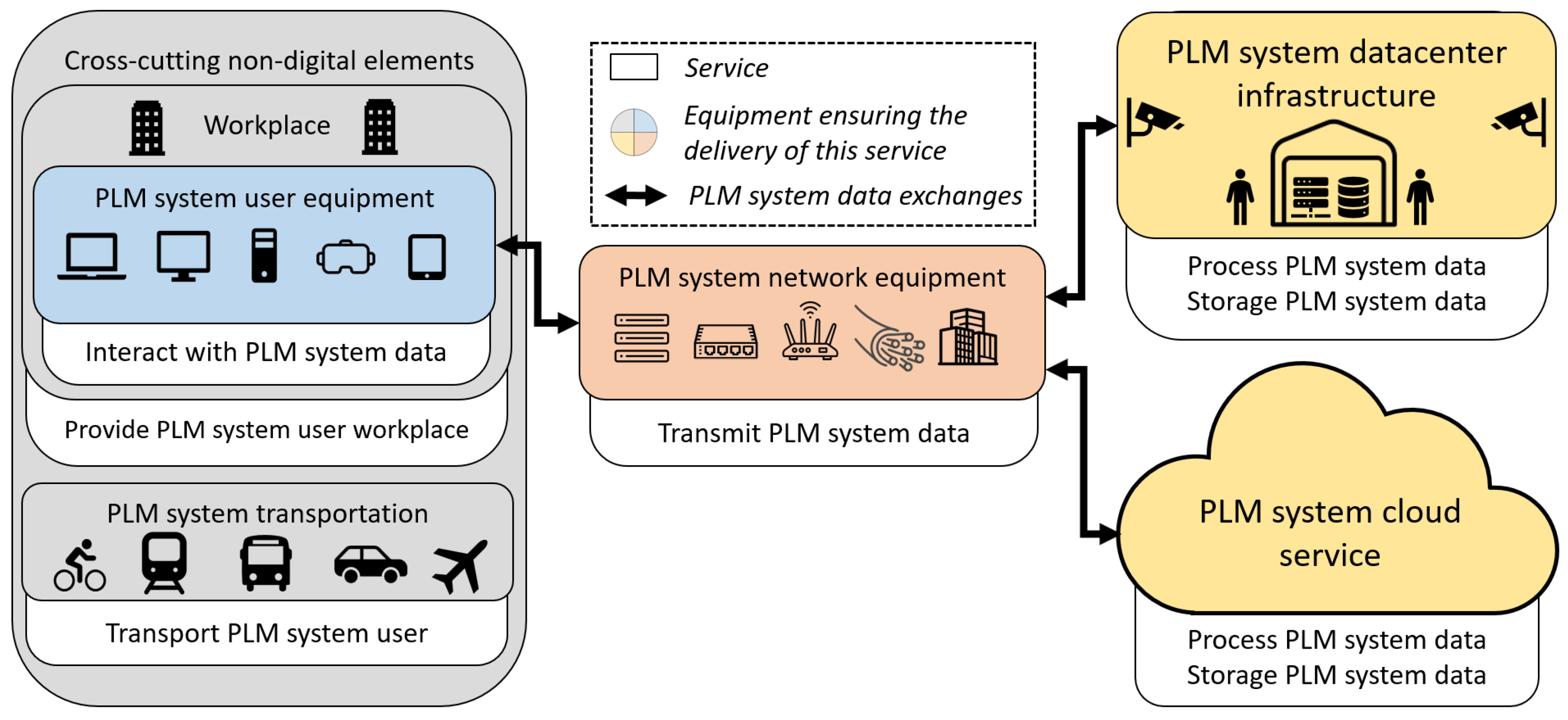 - Datacenter infrastructure: the manufacture, distribution, and use of the datacenter infrastructure building with its associated technical environments (D1) and its IT equipment (D2) belonging to the school for the processing of PLM-related data. Cloud services, which are storage services (D3), are also taken into account in the usage phase.