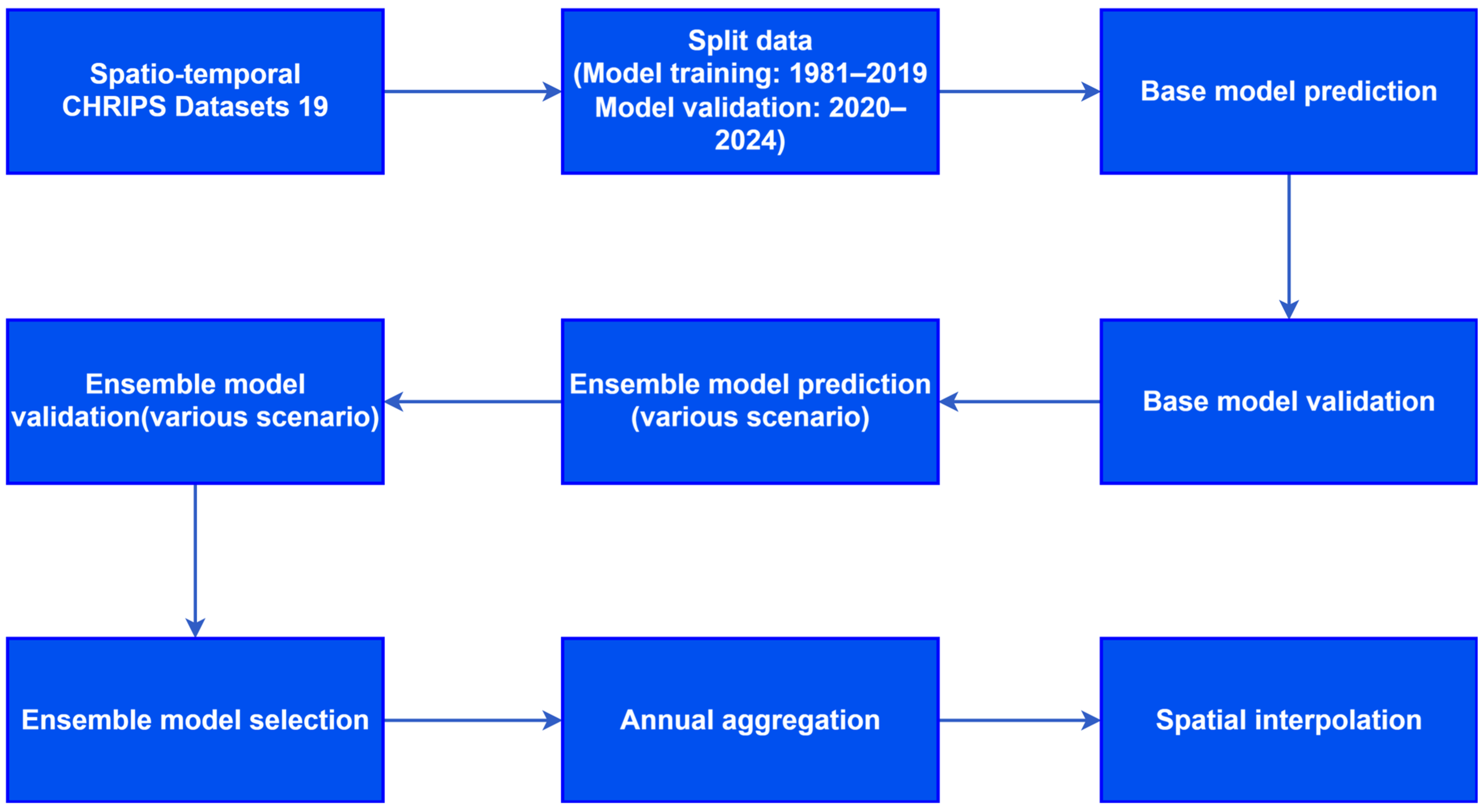 This study employs an integrated workflow based on ensemble stacking for spatiotemporal prediction of annual rainfall for the period 2025–2030 (Figure 2). This research framework begins with the collection of CHIRPS data and watershed area data, the creation of systematic spatial sampling points, the training of various rainfall prediction models (ML and DL), ensemble stacking, performance evaluation, aggregation, spatiotemporal interpolation, and evaluation and analysis to produce projected rainfall maps for 2025–2030.