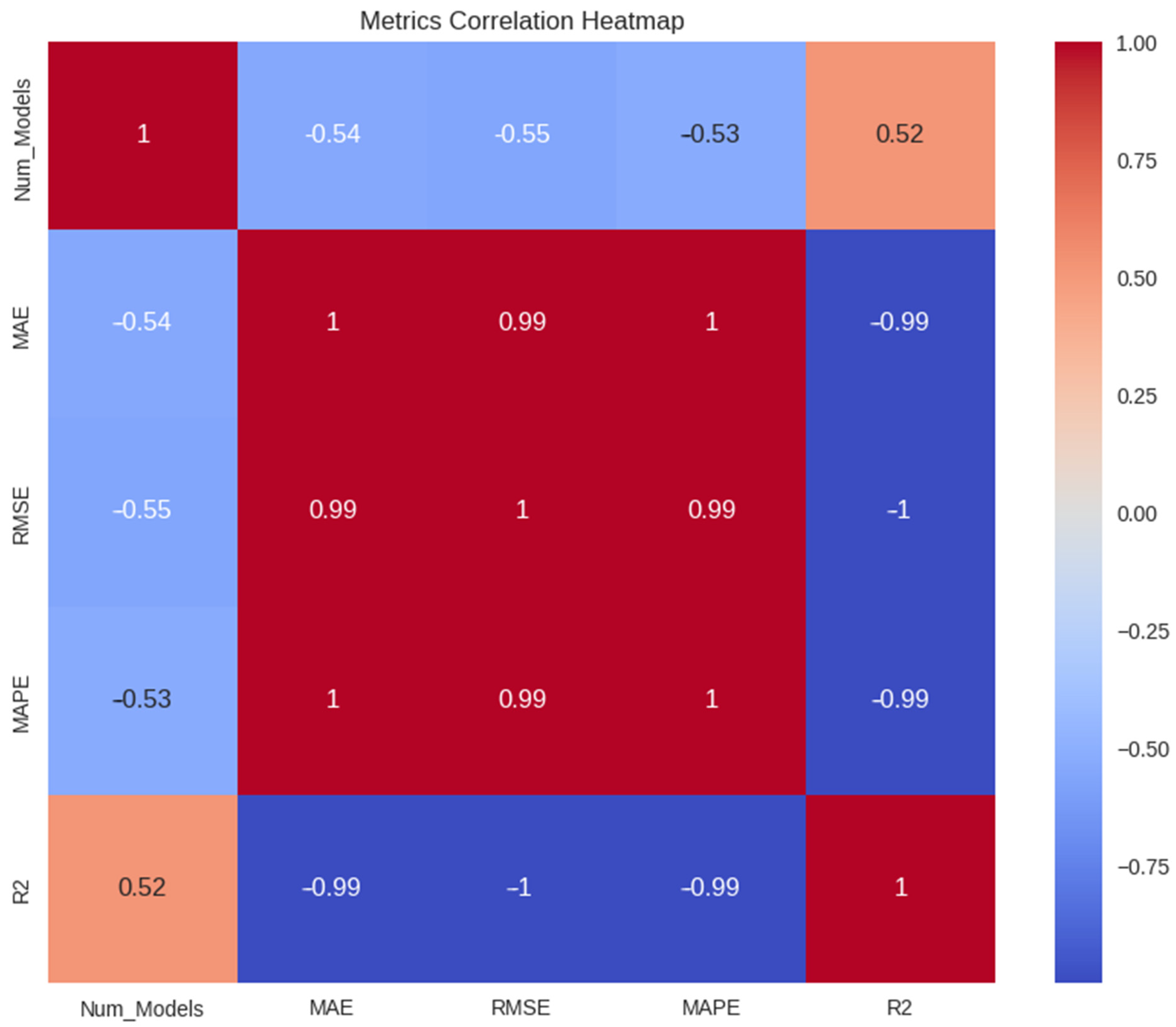Figure 4, the bar plot of the ensemble results, illustrates a consistent pattern that the combination of traditional ML models remains the backbone in the scenarios. These results are in line with findings in the literature that stacking with strong ML base learners is more stable and robust [26,43]. The correlation between metrics (Figure 5) exhibits a consistent pattern: MAE, RMSE, and MAPE are almost perfectly correlated (≈ranging from approximately 0.99 to 1.00), while all are almost perfectly negatively correlated with R2 (≈ranging from approximately −0.99 to −1.00). This is reasonable because R2 is mathematically related to MSE/RMSE (R2 = 1 − SSE/SST). Hence, a decrease in absolute error is almost always accompanied by an increase in R2, provided that the observation variability remains similar between scenarios. On the other hand, the number of models in the ensemble is moderately correlated with performance improvement (number of models vs. MAE/RMSE/MAPE ≈ −0.53 to −0.55; vs. R2 ≈ +0.52), indicating that adding diversity to the base learner generally improves accuracy but with diminishing returns after a certain point (Figure 6).