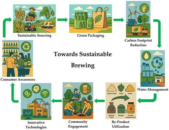 The 19th century catalyzed industrialization through pasteurization, cooling, controlled fermentation, steam power, and rail logistics, delivering consistent quality and mass distribution [23,24]. The 20th century brought mature “beer engineering”: stainless steel and glass-lined equipment, and widespread adoption of cylindrical-conical fermenters (CCTs) reduced contamination, improved safety, and compressed production cycles [24]. Advances in yeast genetics and biochemistry enabled selection for aroma, alcohol tolerance, and low off-flavor formation; aseptic propagation and cryopreservation supported robust operations [25,26]. Since the late 20th/early 21st century, sustainability and circularity have become central, with best-practice water use below ~3 hl/hl, heat and CO2 recovery, valorization of spent grains/yeast, and advanced wastewater treatment [1]. Data analytics integrated quality monitoring with supply chains and sales, shortening time-to-market; current innovation directions include de-alcoholization with aroma retention, preservative-free stability, and sensory profiling via hop/yeast biotransformation [27,28,29].