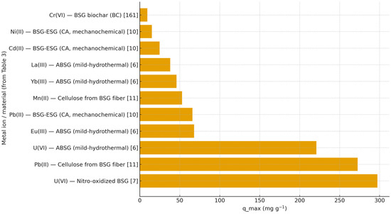 Over roughly two decades, the literature progressed from proof-of-concept batch tests on raw BSG to engineered, selective sorbents and continuous-flow demonstrations. Early studies reported uptake of Cu(II), Cd(II), Pb(II), Ni(II), and others by unmodified BSG, with equilibria frequently described by Langmuir and Freundlich isotherms and pseudo-second-order kinetics [3,6]. Subsequent strategies—citric-acid esterification, nitro-oxidation, ion-imprinting, and thermochemical conversion to biochars/activated carbons—improved capacity, selectivity, and in some cases regeneration, yielding materials that rival commercial carbons (e.g., for Cr(VI) via reduction–adsorption under acidic conditions) [7,8,9,10,11,12]. Parallel streams upcycle fiber-rich BSG fractions to cellulose adsorbents effective for Pb and Mn in real waters, aligning with food-sector circularity [13], while studies on organics (dyes, pharmaceuticals) demonstrate π–π interactions, hydrogen bonding, and electrostatics on BSG-derived surfaces [14].
