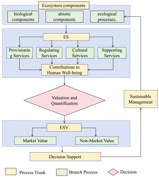 Ecosystem services, as the key link between the natural environment and human society, refer to the material and non-material benefits that humans directly or indirectly obtain from the functions and processes of natural ecosystems [1,2]. Current international frameworks, such as the one proposed by IPBES, have further expanded this concept, defining it as “all the benefits or harms contributed by nature to individuals, communities, societies, nations, or humanity as a whole” (referred to as Nature’s Contributions to People, NCP) [3]. This framework emphasizes the role of diverse knowledge systems and cultural contexts in understanding ecosystem services. Meanwhile, the European Union’s Mapping and Assessment of Ecosystems and their Services (MAES) [4] has also advanced ecosystem services from a conceptual stage to practical application in spatial integration and decision support. Classified into four categories, namely, supporting, provisioning, regulating, and cultural services, they have a profound impact on human well-being [5]. The coordinated management of the multiple objectives of ecosystem services represents a significant challenge for the sustainable development of social–ecological systems, requiring adaptive trade-off choices based on different stages of socioeconomic development [5,6]. The concept of ecosystem service value (ESV) provides a quantitative measure of an ecosystem’s capacity to support human well-being and serves as a critical indicator in spatial planning and policy-making [7]. To more clearly clarify the conceptual chain from ecosystem functions to services, and further to the assessment of their values, this study constructs the conceptual framework shown in Figure 1, which systematically presents the logical connection between ES and ESV.