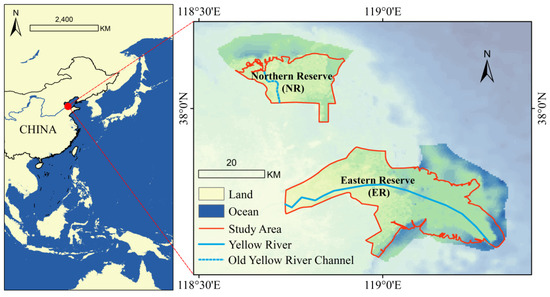 The YRDNNR consists of two sections: the Yellow River estuary and the old river channel previously used for flood diversion before 1976. These two parts referred to as the Eastern Reserve (ER) and the Northern Reserve (NR), respectively [21]. The reserve is composed of both marine and terrestrial ecosystems. However, due to the incomplete nature of the marine data and the fundamental differences in material cycling, energy flow, and species composition between marine and terrestrial systems, this study focuses solely on terrestrial ecosystems to ensure the accuracy and reliability of our assessment (Figure 2). Excluding marine ecosystems may indeed introduce a bias, as their substantial ESV is absent from our total estimate. Work such as Barbier [40] establishes that the ecosystem services provided by estuarine and coastal ecosystems (ECEs) are of extremely high value. Consequently, our terrestrial ESV is a conservative, lower-bound figure. Our focused approach prioritized methodologically sound and data-driven analysis of the terrestrial component, which is a critical and quantifiable part of the reserve’s total value. Future studies incorporating robust marine data are needed for a complete assessment.