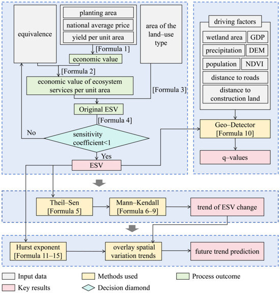 The data processing workflow centers on the research of ESV and comprises four key steps: First, by integrating basic data such as land use and equivalent factors, conduct standardized evaluation and calculation of ESV to define the core base value; Second, analyze the spatiotemporal variation trends of ESV to accurately capture the patterns of increase and decrease across different time periods and regions; Third, explore driving factors, not only identifying the causes of annual differences but also summarizing the long-term average dominant factors; Fourth, predict the future spatial distribution of ESV by coupling the Hurst exponent with the existing spatial distribution status, thereby providing a scientific basis for ecological protection and planning. The specific flow chart is shown in Figure 3.