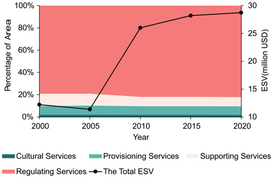 From the perspective of total ESV, the values for the years 2000, 2005, 2010, 2015, and 2020 were 1.2205 billion US dollars per hectare, 1.1363 billion US dollars per hectare, 2.6013 billion US dollars per hectare, 2.8212 billion US dollars per hectare, and 2.8725 billion US dollars per hectare, respectively. Between 2000 and 2020, the ESV of the nature reserve showed a pattern of decline in the early stage and subsequent steady growth, as shown in Figure 5. The lowest ESV was recorded in 2005, primarily due to a substantial reduction in the areas of grasslands and water bodies (Table 5). As these two ecosystems provide significant services in various aspects such as provision and regulation, their contraction directly contributed to the sharp drop in total ESV.