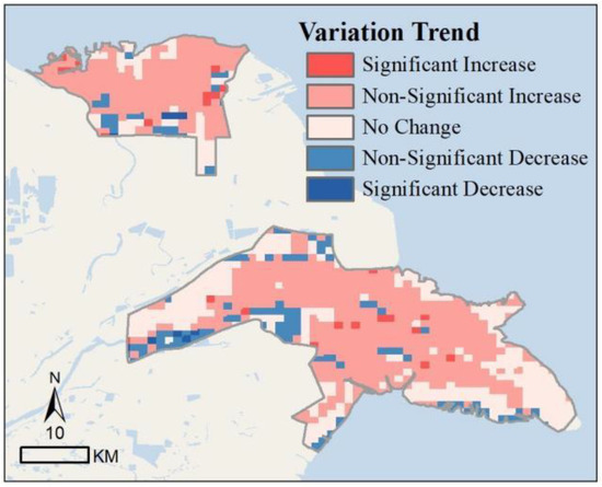 The significance level was set at 0.05. By consulting the standard normal distribution table, the critical value can be determined. If the test statistic , the trend is considered to have met the significance criterion at the 95% confidence level, suggesting that the trend change in ESV is statistically significant. The classification of trend characteristics following the MK test is presented in Table 3.