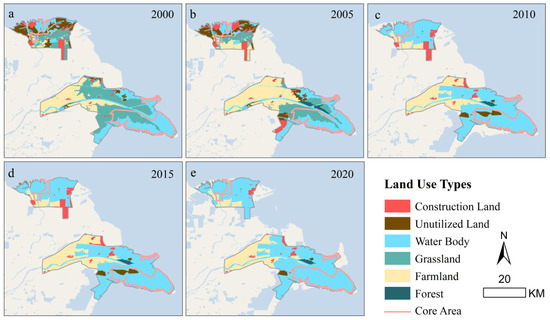 Land use types distribution maps. In the figure, (a–e) represent the years 2000, 2005, 2010, 2015, and 2020, respectively.