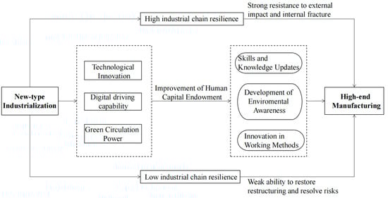 On the other hand, a highly resilient industrial chain typically facilitates smoother resource flows and more efficient information exchange [31]. When resources can quickly adapt to shifting market demands, each segment of the supply chain can coordinate more effectively, supporting the high levels of efficiency and innovation required by new-type industrialization. A resilient supply chain not only enables rapid adaptation to market fluctuations but also allows high-end manufacturing enterprises to respond more swiftly to customer needs, thereby enhancing their competitiveness. This flexibility is particularly vital in high-end manufacturing, where technological cycles are short, and responsiveness is key. Based on the above analysis, the role of industrial chain resilience in mediating the relationship between new-type industrialization and high-end manufacturing development is not static. Thus, the following hypothesis is proposed: