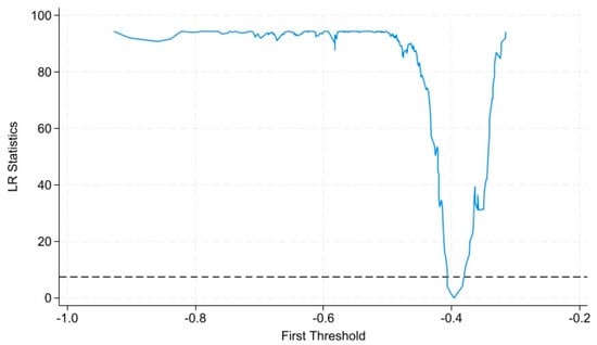 To test whether the elasticity of the industrial chain affects the effect of new-type industrialization on high-end manufacturing in a nonlinear manner, that is, to explore whether there are structural fractures or jumping characteristics in the variable relationship [50], we established a panel threshold model and introduced industrial chain elasticity as the threshold variable. We used the Bootstrap method to conduct 500 repeated samplings to test threshold effects and determine the number of thresholds. The results in Table 8 indicate that the test passed at a significance level of 1%, indicating the presence of significant threshold effects. Based on the maximum likelihood ratio function diagram (Figure 3) corresponding to the threshold value, a single threshold model is more reasonable.