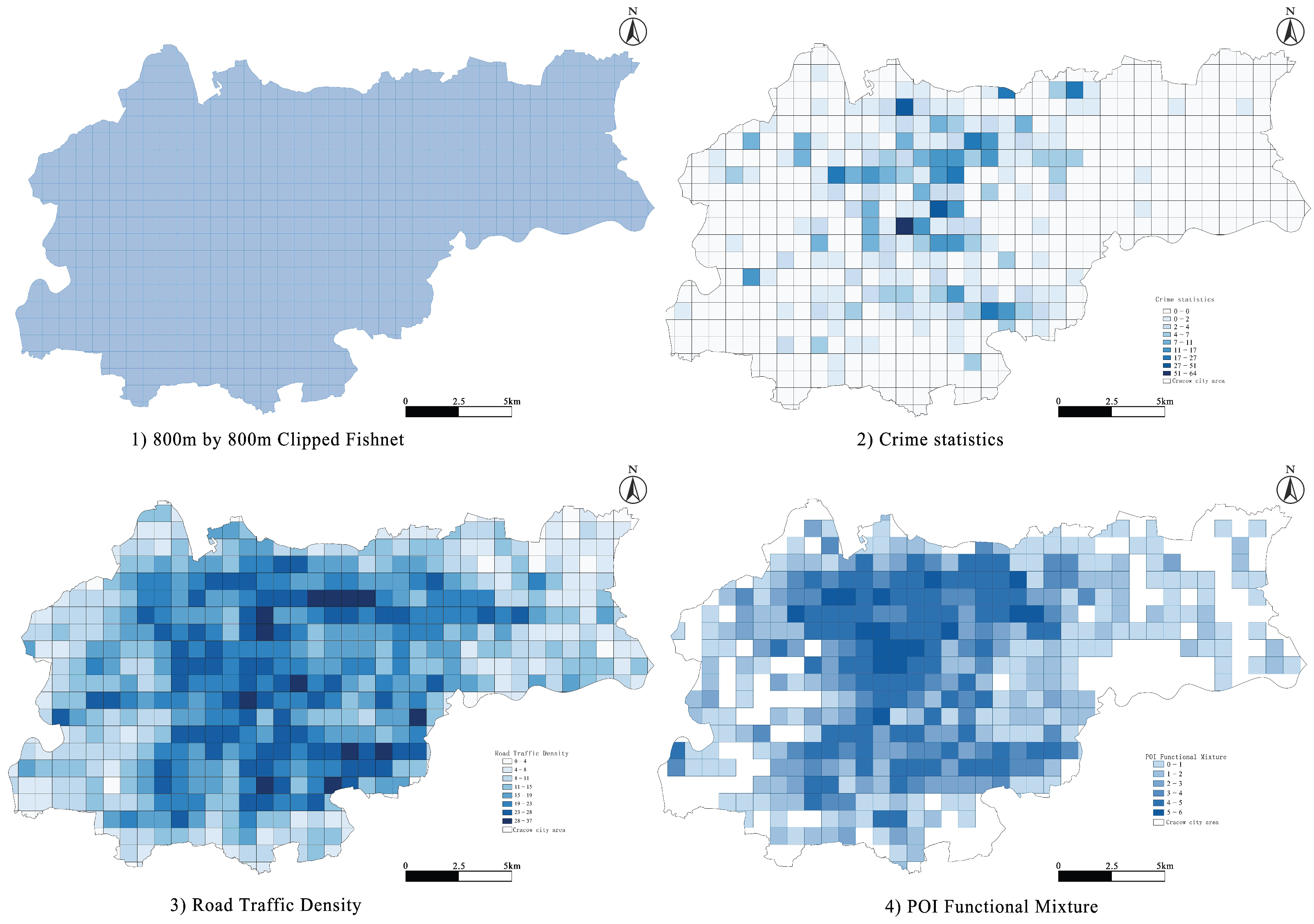 To quantify the impact of built-environment factors on urban safety hazards and to identify the key spatial elements influencing residents’ propensity to report hazards, this study builds a machine-learning model using built-environment data for Cracow together with hazard locations reported via NSTM. During data preprocessing, the study area was partitioned into 800 m × 800 m fishnet grids as the spatial analysis unit (