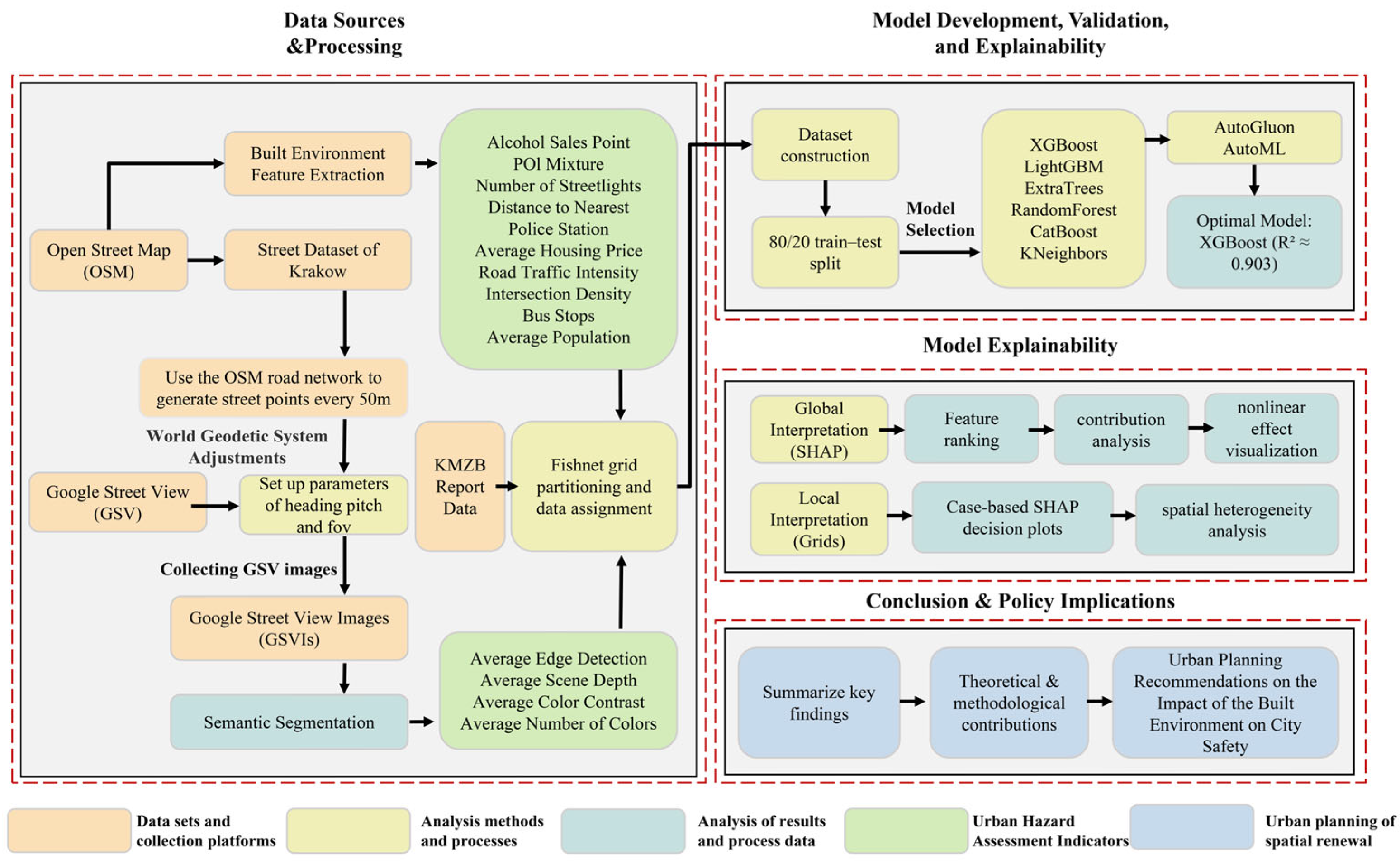 Building on this background, this study focuses on Cracow, Poland, to explore the spatial mechanisms linking built environment features with residents’ reported safety hazards. We integrate multi-source data, including street-level built environment elements (such as POI functional diversity, green space coverage, lighting, transportation node density, and housing prices) and crowdsourced safety hazard reports from the NSTM platform, to construct a spatial database and conduct machine learning modeling. To improve model interpretability and usability, we further employ SHAP (Shapley Additive Explanations) to explain the model results, clarify the extent and direction of each variable’s influence on urban safety hazards, and enhance transparency and operational value.