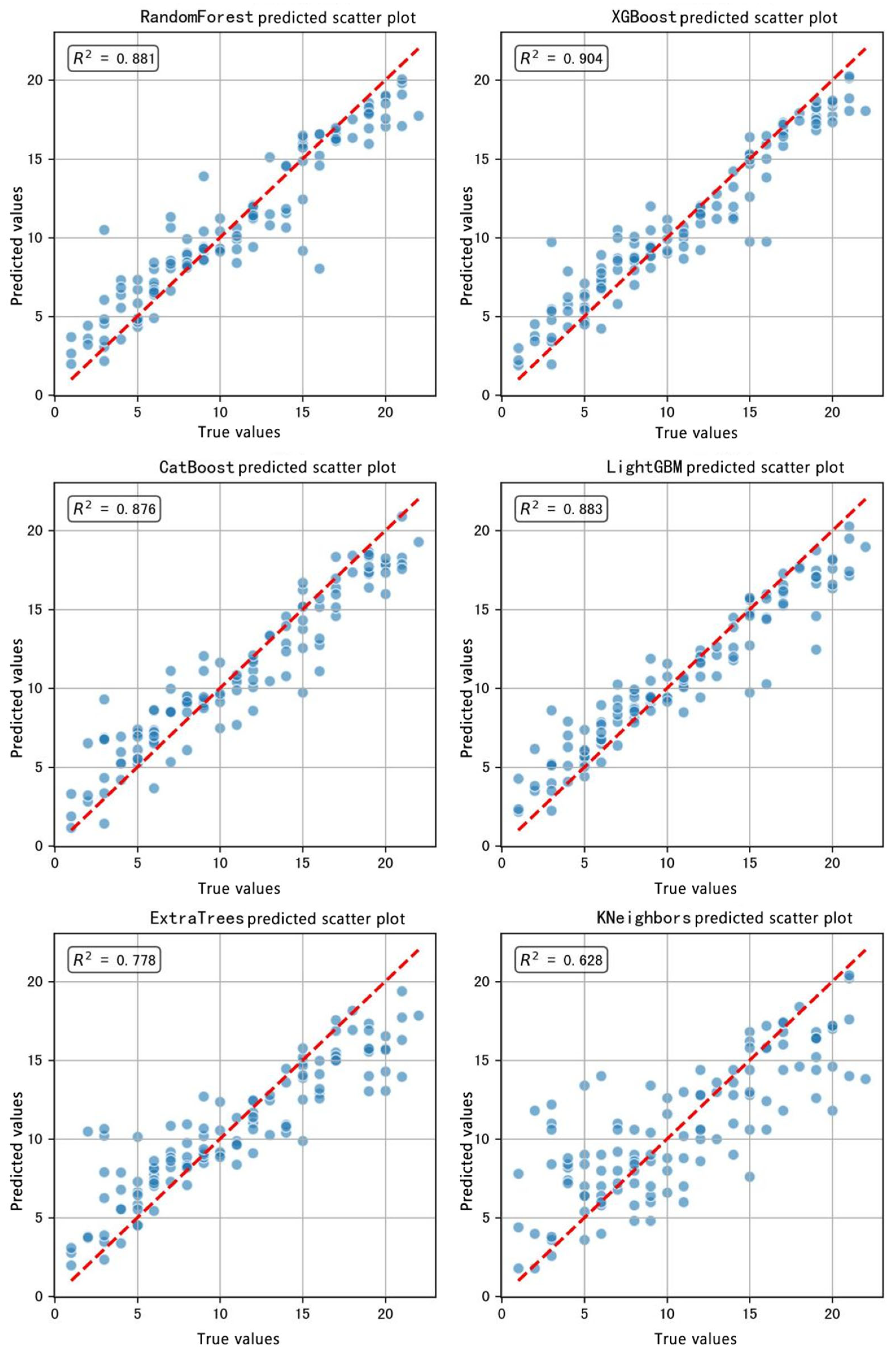 x-axis). The red dashed line (y = x) indicates ideal prediction performance, while the blue scatter points represent the distribution of predicted and actual values for each test sample. The coefficient of determination (R
