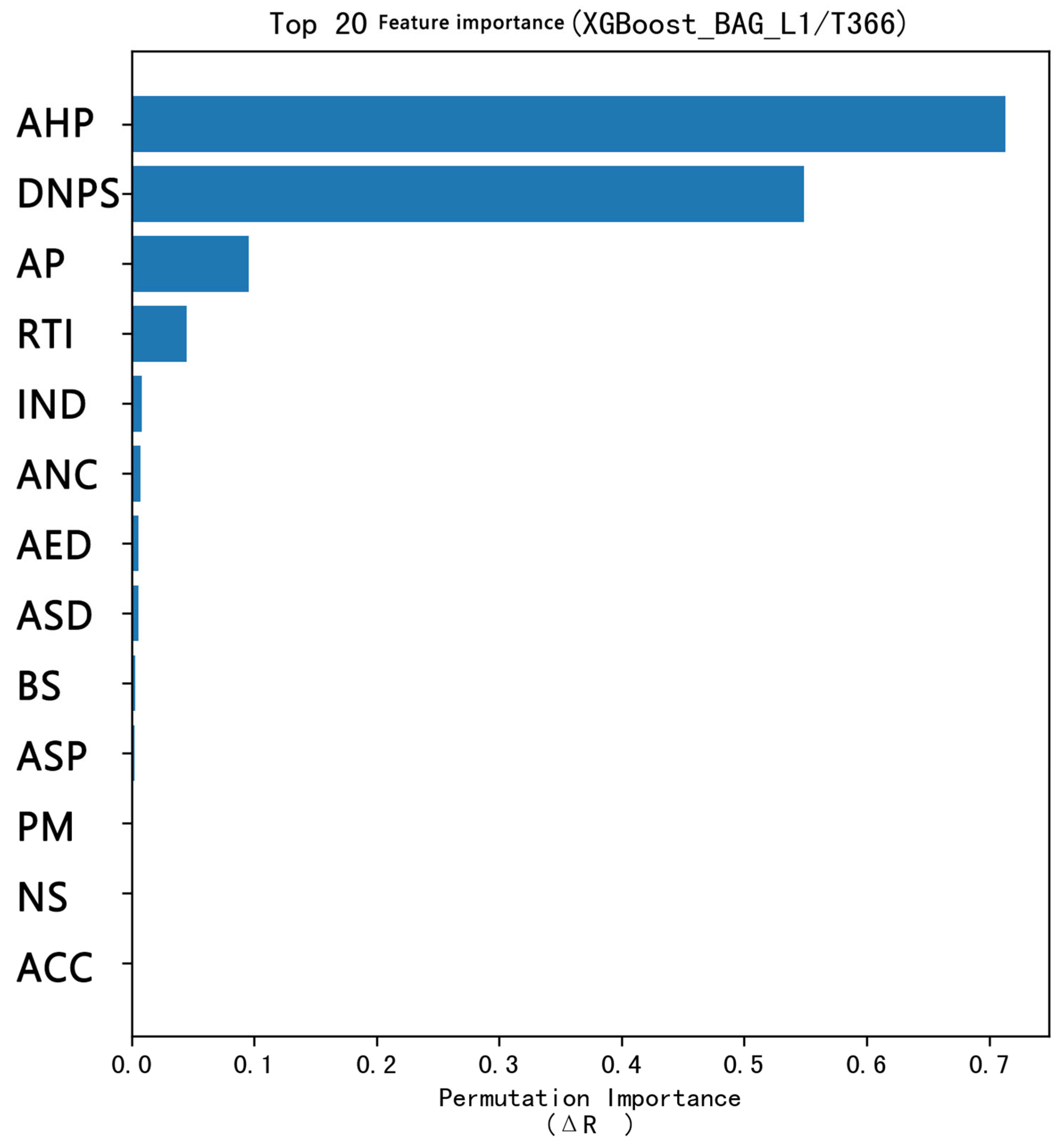 Figure 4 presents the results of feature-importance evaluation for built-environment variables, derived from the XGBoost model (XGBoost_BAG_L1/T366). By applying the permutation importance method and using ΔR
