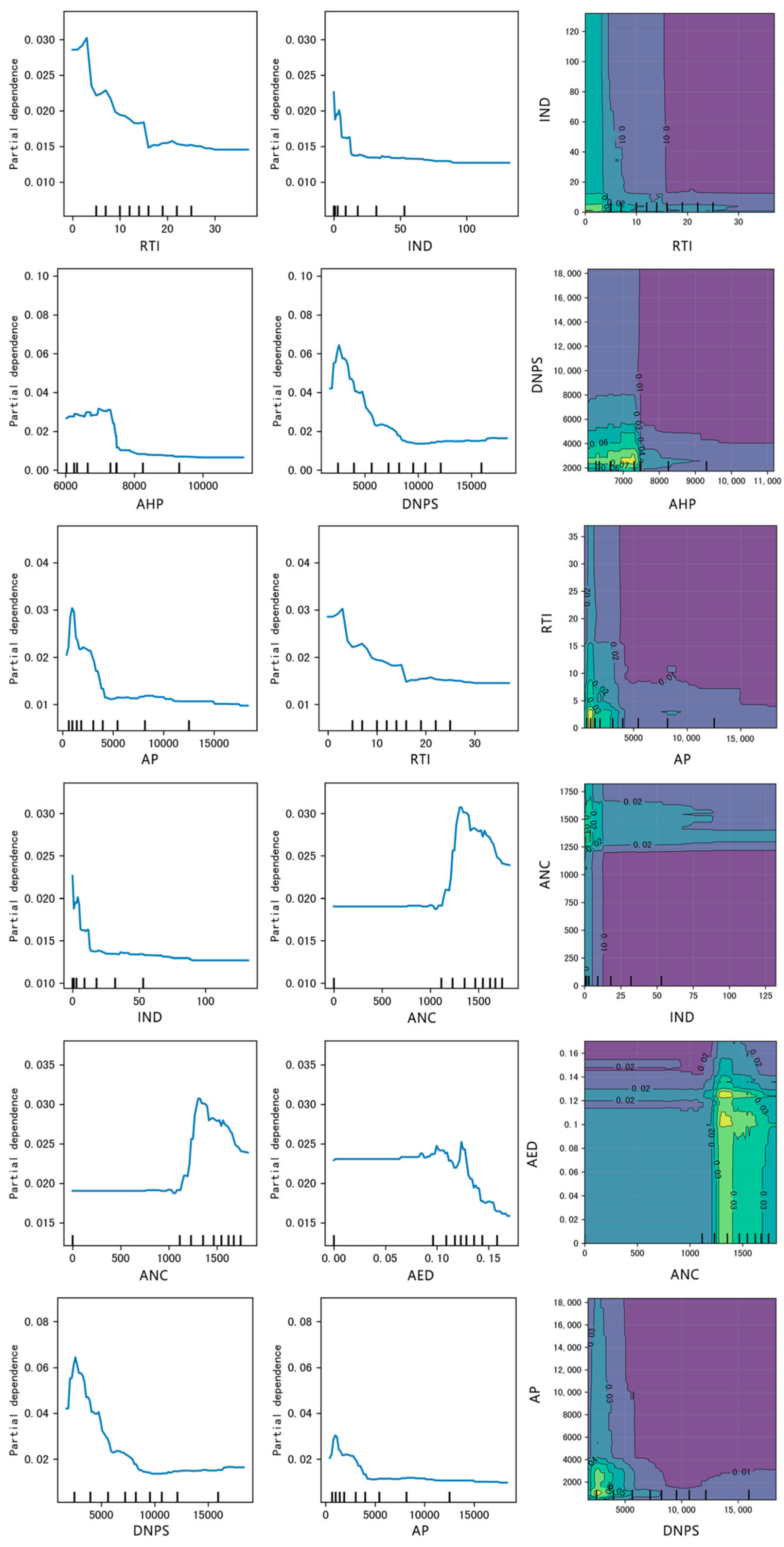 Figure 5). Following the principle of covering key urban dimensions such as transportation systems, socio-economic attributes, visual perception, and public services, six pairs of representative variables were constructed for a two-dimensional partial dependence plot (2D PDP) analysis. This allowed systematic exploration of synergistic gains, marginal effects, and resource-allocation thresholds of built-environment factors, with the aim of providing quantitative support for the prevention and optimization of urban safety hazards.