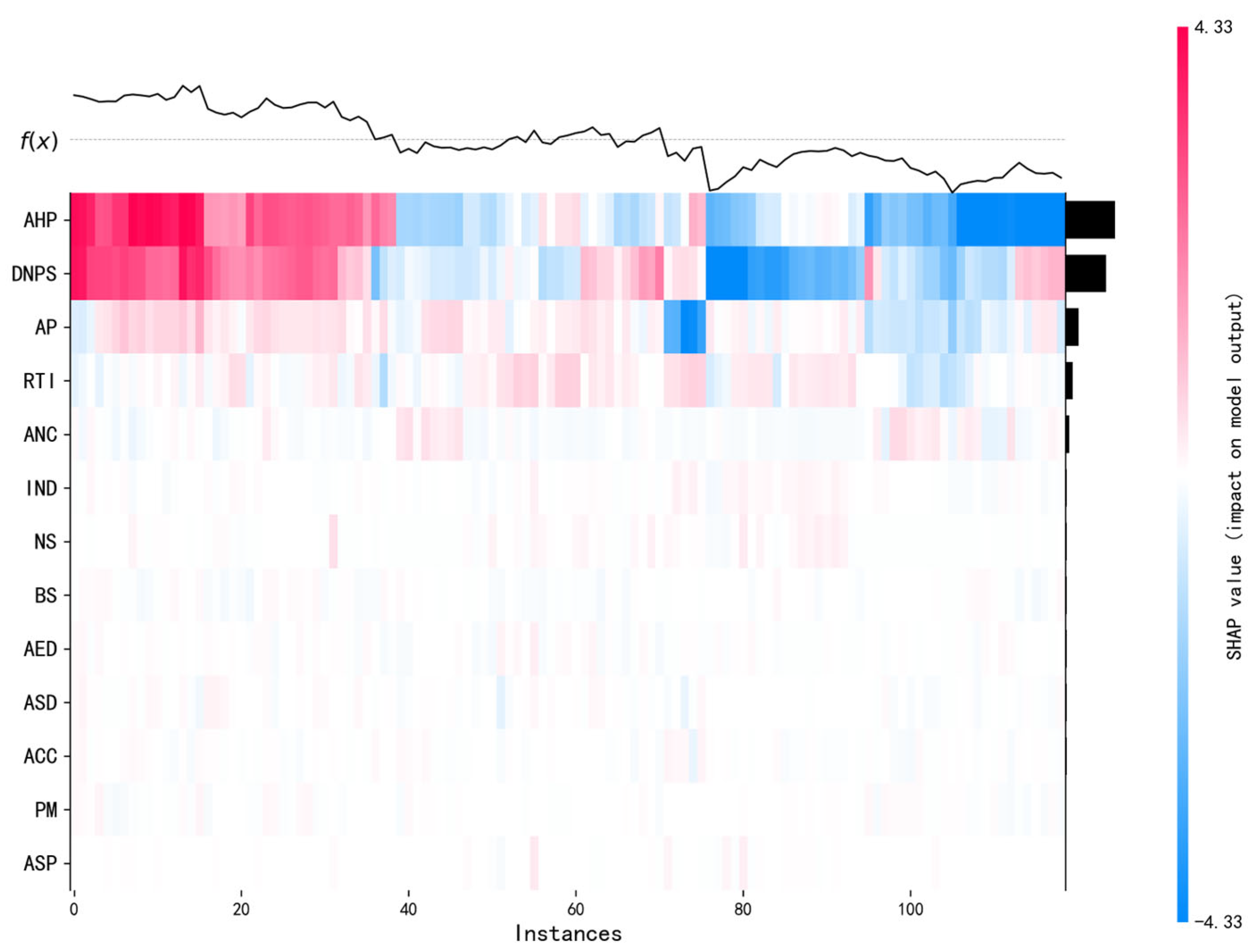 Figure 8 presents the feature-contribution heatmap based on SHAP values. From the figure, it can be observed that “average housing price” appears as deep red in most samples, indicating a significant positive contribution to safety-hazard evaluation and serving as the strongest driver of the overall model output. This suggests that higher housing prices are often associated with stronger perceived safety, possibly reflecting the role of better living environments and supporting facilities in enhancing residents’ sense of security. The “distance to the nearest police station” follows closely, exhibiting an alternating pattern of deep red and deep blue across many samples. This indicates a complex influence: greater distances from police facilities may weaken residents’ sense of perceived safety, while closer deployments may reinforce safety-hazard perception. Thus, this variable makes a substantial contribution to safety-hazard evaluation as well. The “average population” variable displays relatively darker shades in certain samples, suggesting that population density exerts a moderating effect on safety-hazard outcomes in specific areas. By contrast, transportation and lighting-related indicators such as “road traffic,” “number of intersections,” and “streetlight count” generally appear in lighter colors, implying weaker overall effects, though notable contributions can still be found in localized samples. Visual-related variables such as “average color count,” “average color contrast,” and “average scene depth” also show mostly light shading, reflecting limited explanatory power in the model. Nevertheless, they do produce certain positive or negative fluctuations in specific instances. Additionally, “POI functional diversity” and “number of alcohol outlets” appear relatively uniform and faint across the heatmap, suggesting only minor overall effects, though they may hold localized significance under particular conditions. In sum, the heatmap provides an intuitive representation of how different built-environment features influence safety-hazard predictions. It highlights both the dominant drivers and the more localized, context-dependent effects, offering valuable insights into the underlying logic of the model and the relationship between urban spatial features and safety-hazard outcomes.