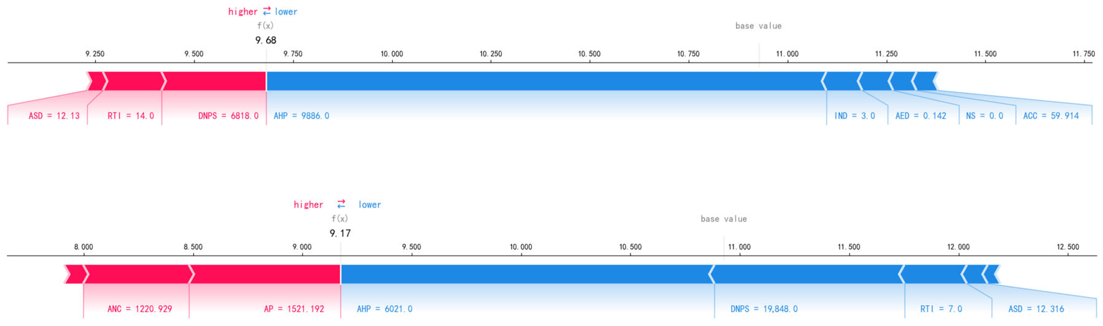 Figure 9) were generated to display only the top eight features with the highest SHAP values for each sample, with feature values retained to three decimal places.