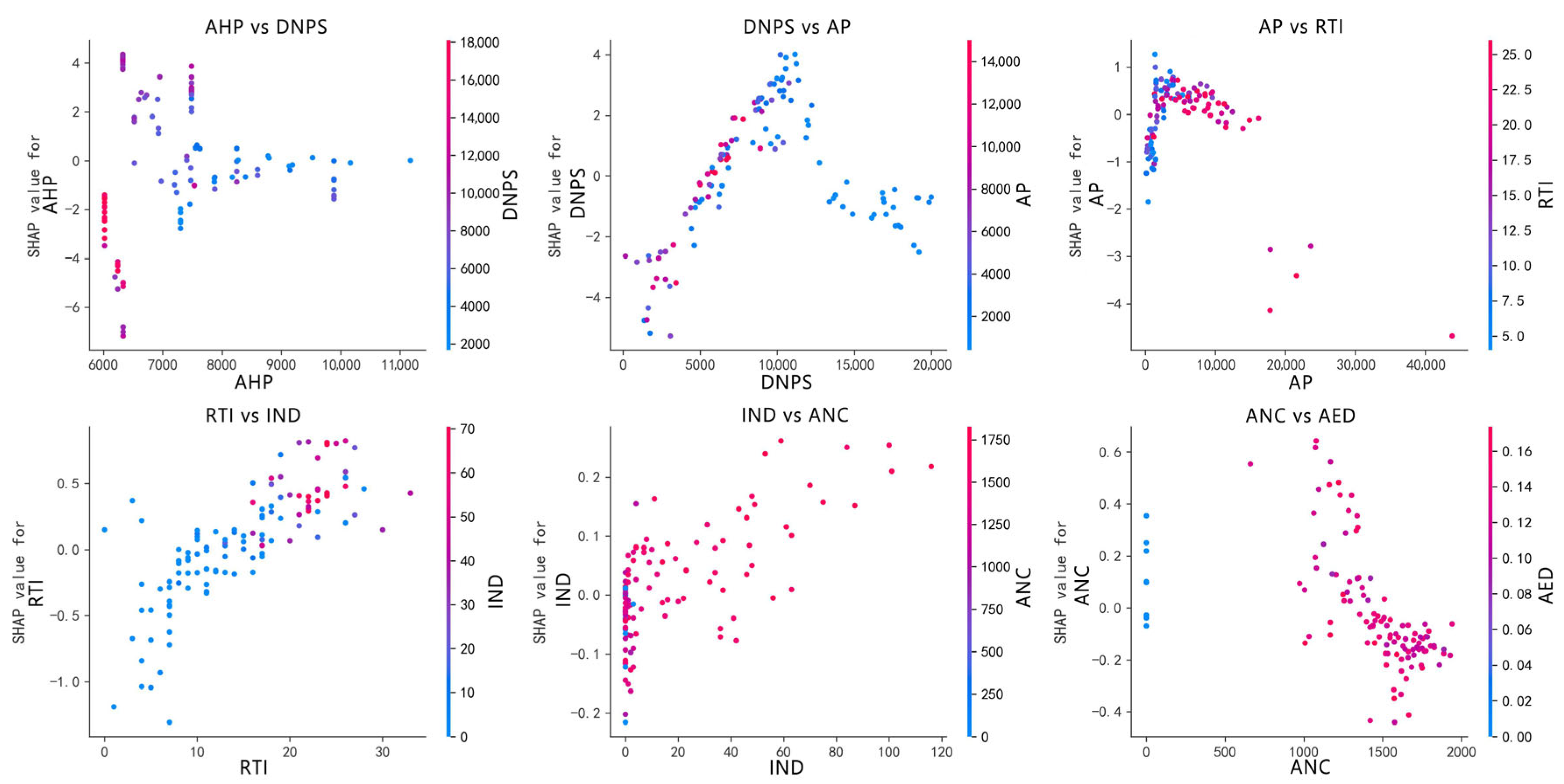 Figure 14 presents SHAP dependence plots for pairwise combinations of key built environment features, visually revealing how synergistic effects and mutual constraints jointly shape safety-hazard predictions at the grid-cell level. Through in-depth analysis of six representative variable interactions, this study identifies a series of characteristic nonlinear coupling patterns.