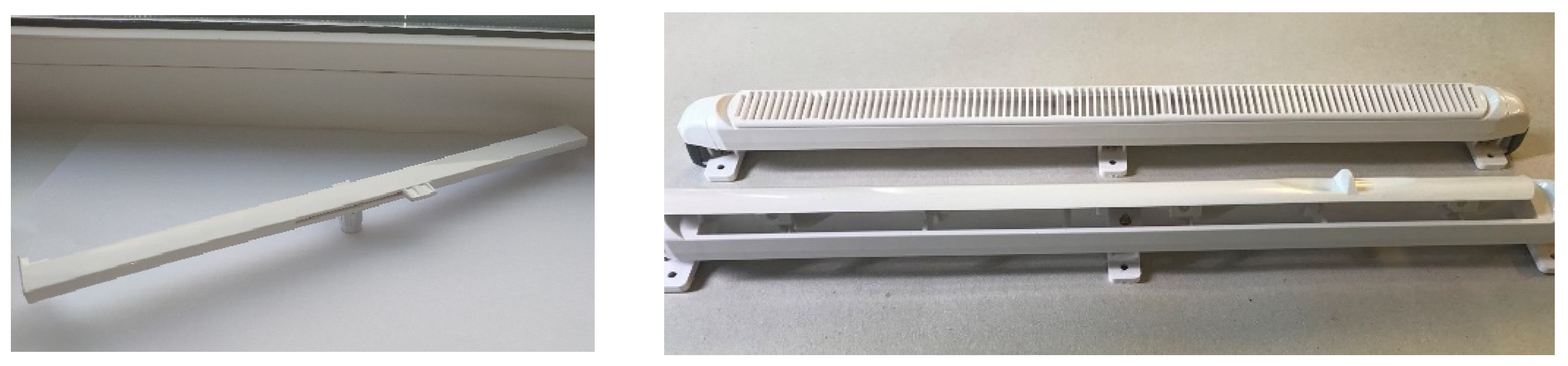 Urban microclimate and morphology strongly influence the natural ventilation potential (NVP): by combining the urban surface model with EnergyPlus, Xie et al. show that NVP efficiency and cooling energy savings vary with building density and season, and that in dense structures, one-way ventilation can be comparable to cross-ventilation efficiency. This finding supports the use of facade-integrated passive air inlets, such as cross-ventilators, when cross-ventilation is geometrically impossible. They also demonstrate that relying on rural weather data biases NVP efficiency estimates in urban areas, highlighting our focus on pressure-dependent performance, which is sensitive to the real-world urban wind and smoke conditions our devices will encounter [15]. At the room scale, the hydromechanical basis determining “how” inlet openings remove pollutants matters: Kay and Hunt quantify the transient development and washdown efficiency of naturally ventilated rooms as a function of heat source distribution and the effective area of the inlet openings; for large openings, a uniformly distributed airflow provides faster washdown, while for smaller effective areas, localized jets are more effective. This model explains why the effective area and placement of small inlet openings significantly influence pollutant removal and supports our decision to consider flow through drip openings as a function of pressure drop and resistance [17]. Building-level retrofits interact with these airflow mechanisms through building envelope selection and management: thermal renovation studies emphasize cost-optimal thermal resistance and portfolio-level selection of energy-saving measures under budget constraints using dynamic programming and life cycle indicators—a context that motivates the combination of low-leakage building envelopes and calibrated background inlets to match indoor air quality without compromising the economic viability of the retrofit [19]. In schools, where occupancy density is high and windows are intermittently used, field campaigns report mean airtightness of n50 ≈ 7 h−1 and average CO2 ≈ 1878 ppm, with 42% of classrooms exceeding 2000 ppm when windows are closed; such evidence has led authorities to promote natural-ventilation strategies even where mechanical ventilation is nominally required, highlighting the need for reliable, passive air pathways that can temper CO2 without continuous window opening [25]. Additional classroom research conducted during the COVID-19 period uses CO2 as a practical indicator of indoor air quality and develops opening schedules that balance infection risk reduction with thermal comfort, again pointing to the role of controlled background air inlets to maintain baseline air exchange with doors and windows closed [18]. In addition to indoor air quality, thermal comfort/energy studies show that building envelope upgrades and heating control changes lead to changes in radiant temperature and PMV, while periodic temperature reduction can reduce heating energy consumption by approximately 13% over the course of a season, provided transient comfort levels remain acceptable. These results support hybrid solutions that combine small passive air intakes with temporary exhaust ventilation or heating controls to stabilize both comfort and indoor air quality in renovated schools [26,27]. Taken together, these applications justify our methodological focus on characterizing airflow through vents as a function of indoor-outdoor pressure differences, and on discussing their integration into hybrid systems, particularly for upper-story spaces where stack and wind pressures are low but reliable base airflow is needed.