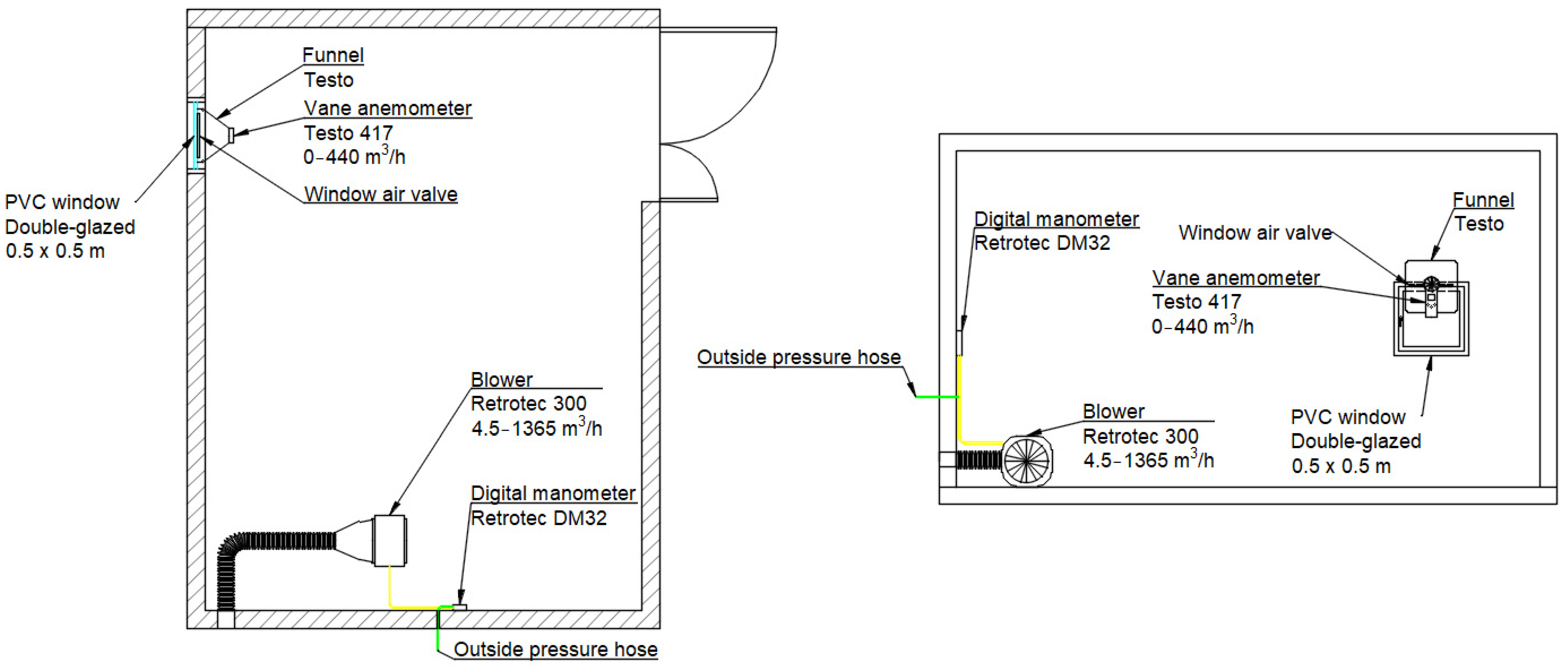 All measuring instruments were factory calibrated before the experiment, and the Retrotec DM32 pressure gauge and Testo 417 vane anemometer (Testo SE & Co. KGaA, Titisee-Neustadt, Germany) was further calibrated against reference instruments to confirm accuracy within the specified tolerances. Each pressure step was maintained for at least one minute to stabilize the fan and anemometer readings, after which three consecutive measurements were taken for each pressure level. The average value was used in the analysis, and the deviations between repetitions remained within the accuracy of the instruments (±3% for air flow, ±0.4% for pressure). These procedures ensured data reproducibility and minimized the influence of random variations.
