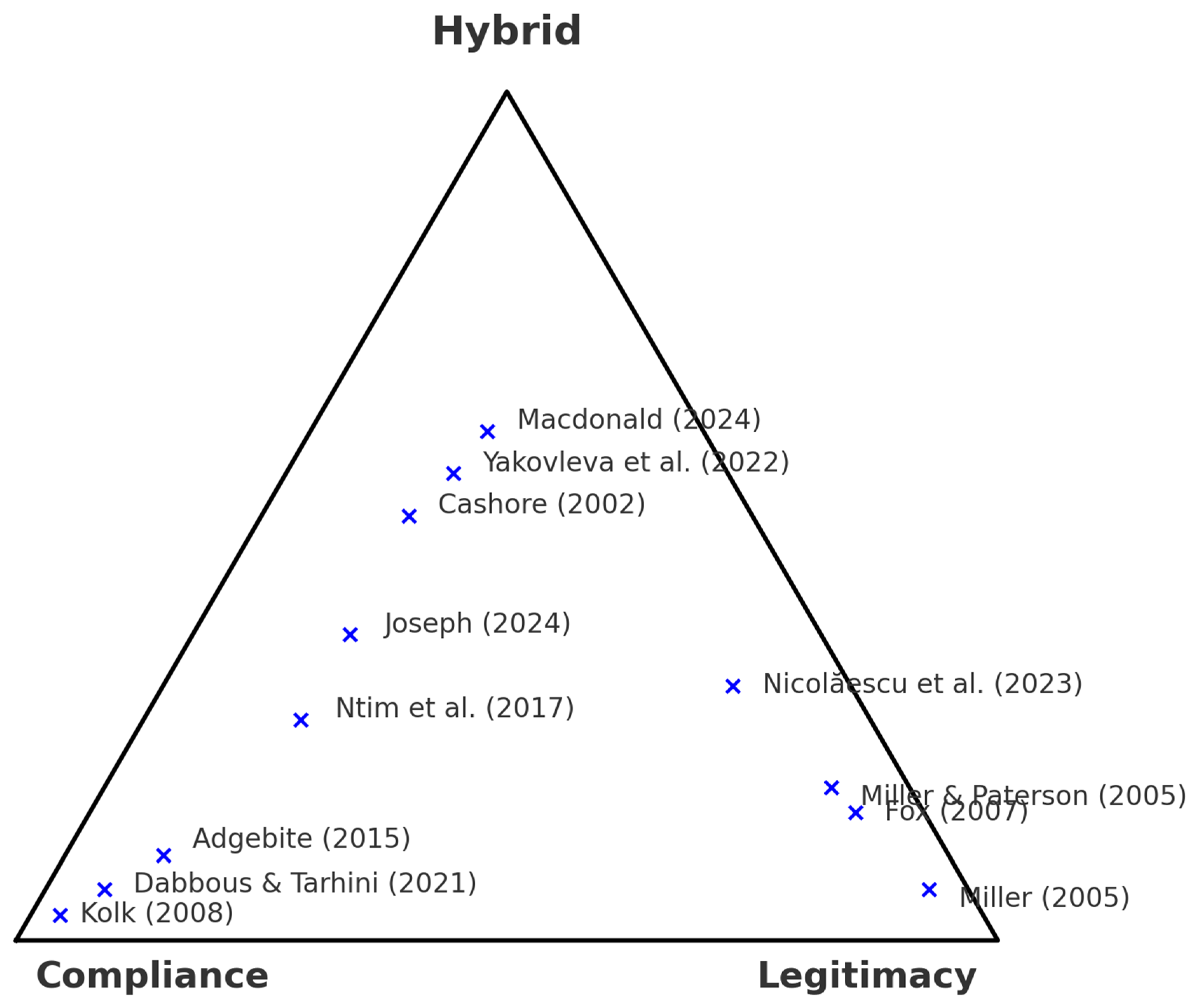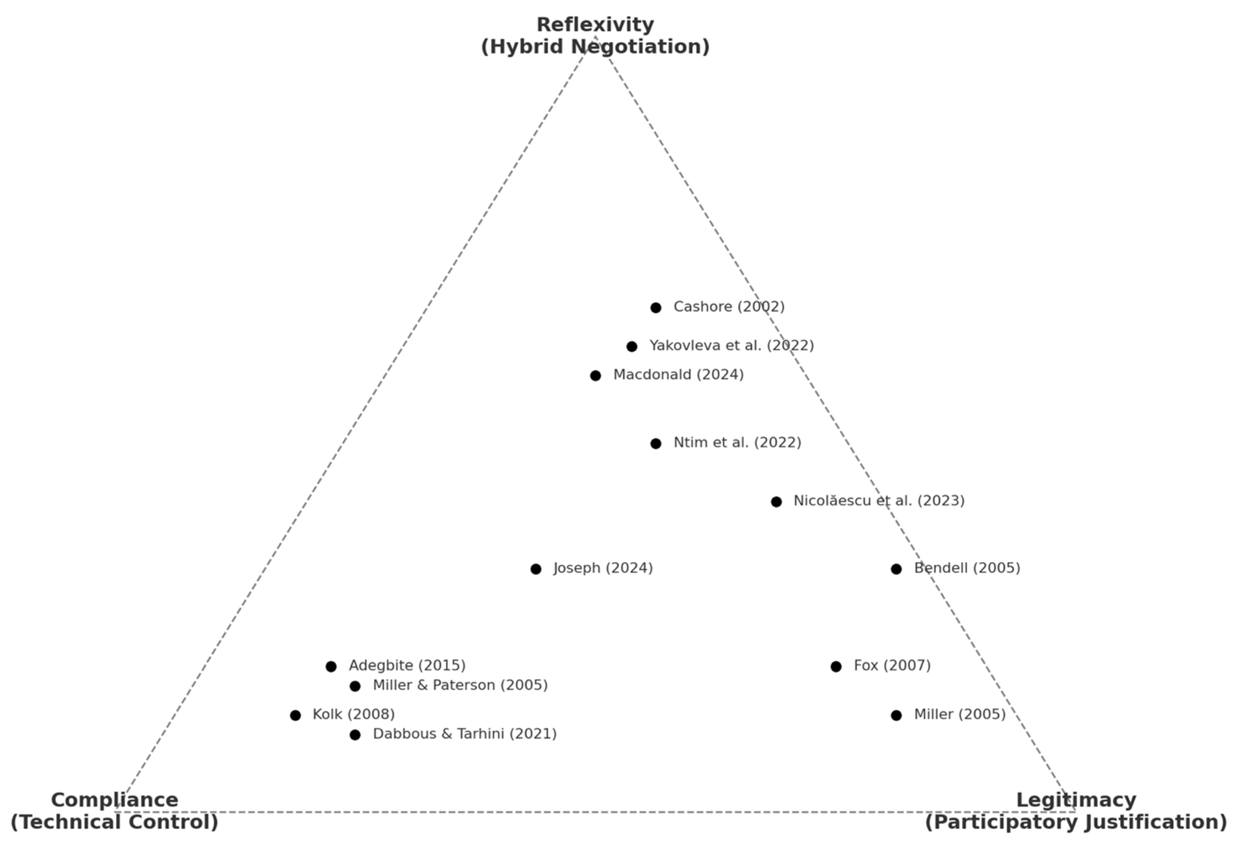 Figure 3—that positions the reviewed literature within a triangular accountability model integrating compliance, legitimacy, and reflexivity.