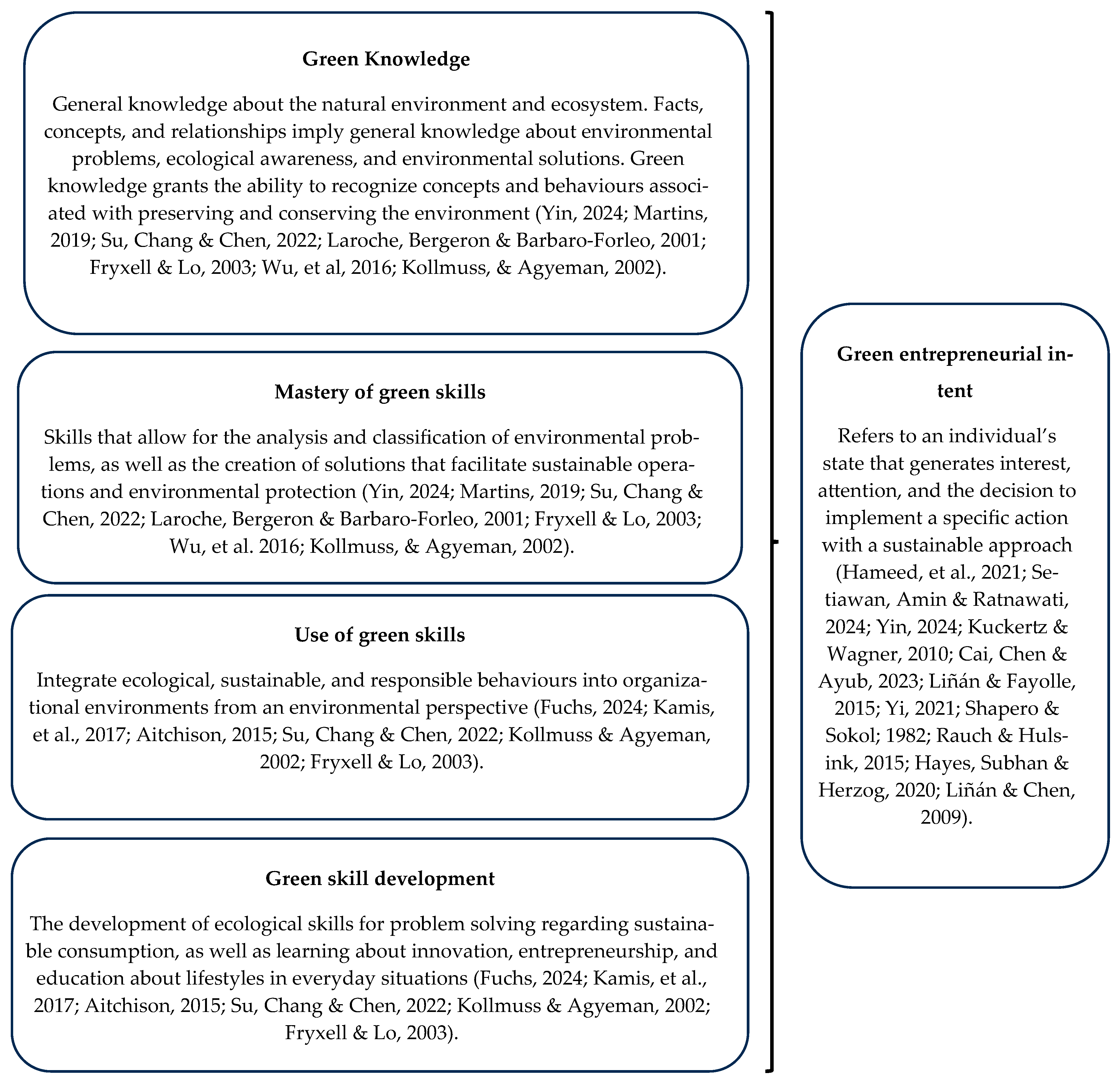- Setiawan, M.H.; Amin, B.F.; Ratnawati, I. Green Entrepreneurial Intentions and University Support for Green Entrepreneurial Behavior: A Systematic Literature Review. Res. Horiz. 2024, 4, 339–350. Available online: https://journal.lifescifi.com/index.php/RH/article/view/344 (accessed on 22 July 2025).