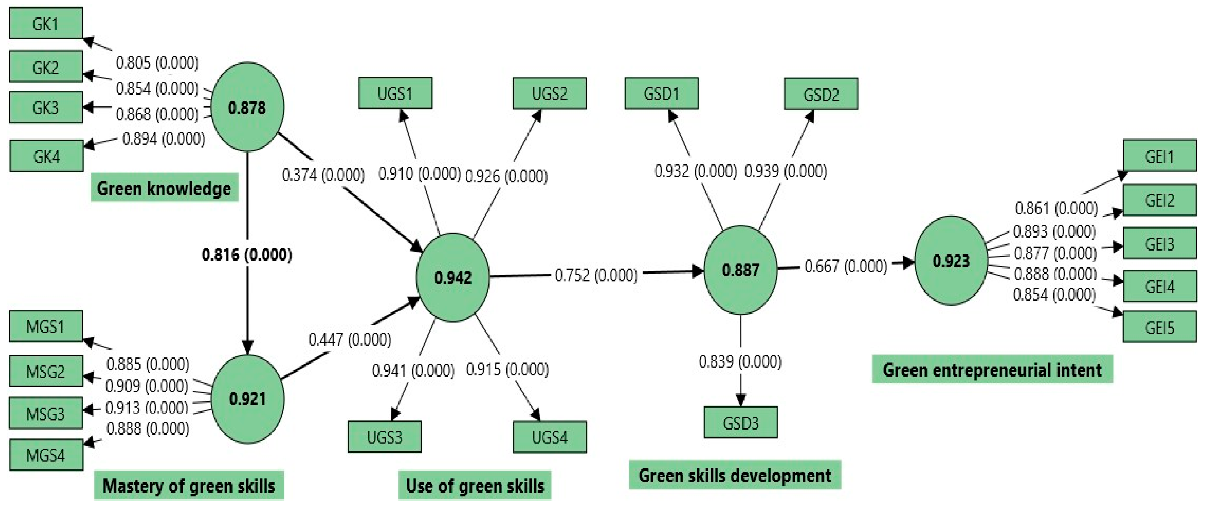 Green skill development -> Green entrepreneurial intent | 0.667 | 0.666 | 0.031 | 21.363 | 0.000 |