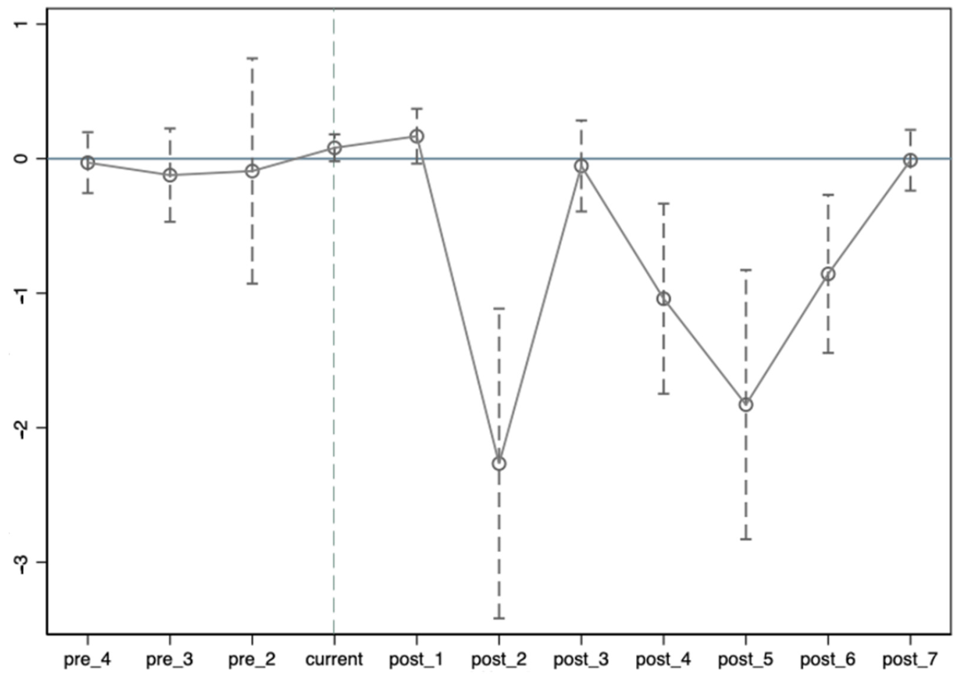 21]. The use of a policy shock provides a strong source of exogenous variation. However, a potential threat to identification is if time-varying shocks correlated with the reform also differentially affected treatment and control firms. We address this by: (1) conducting a parallel trend test to validate the DID assumption; (2) performing a placebo test to rule out confounding effects from other events.
