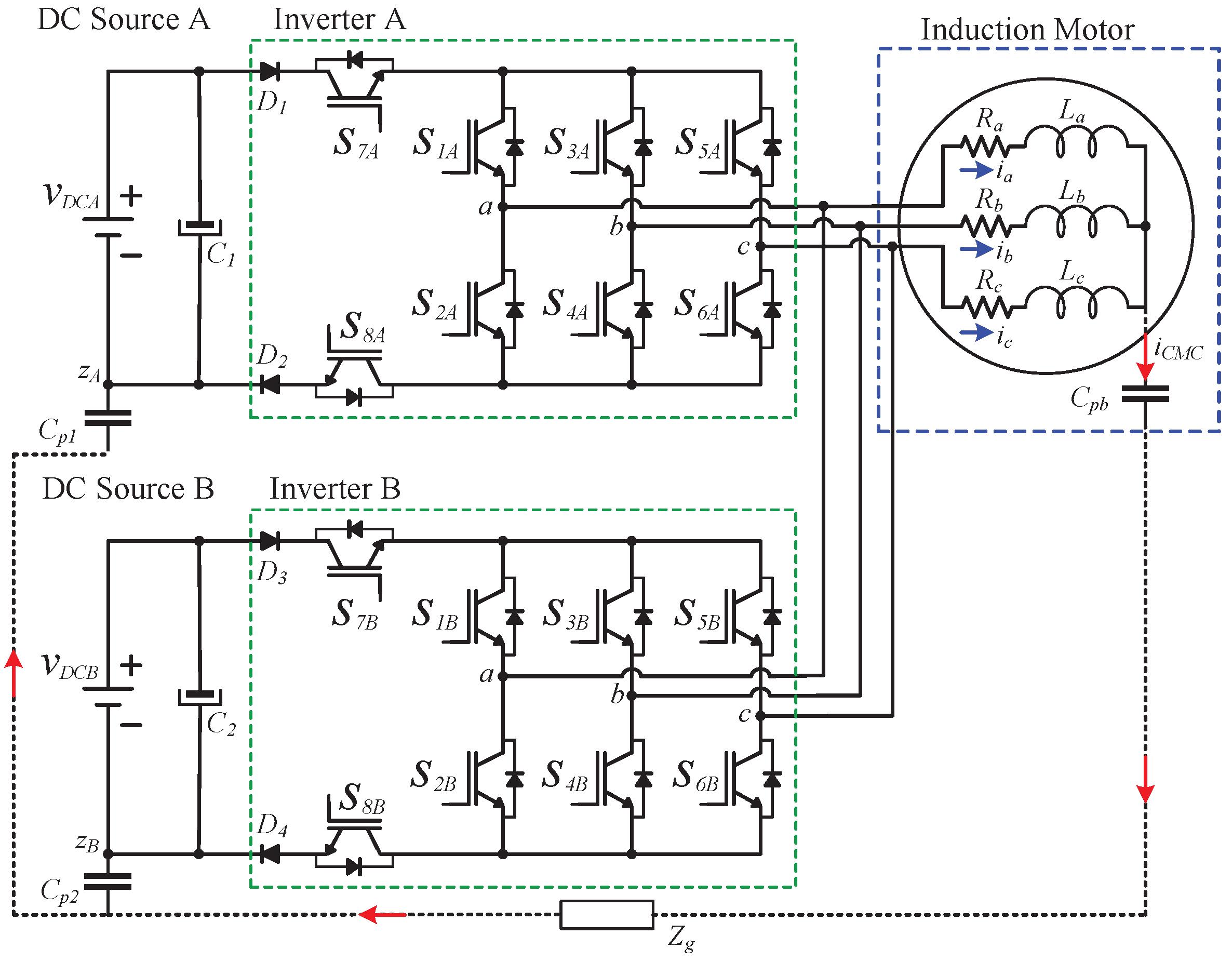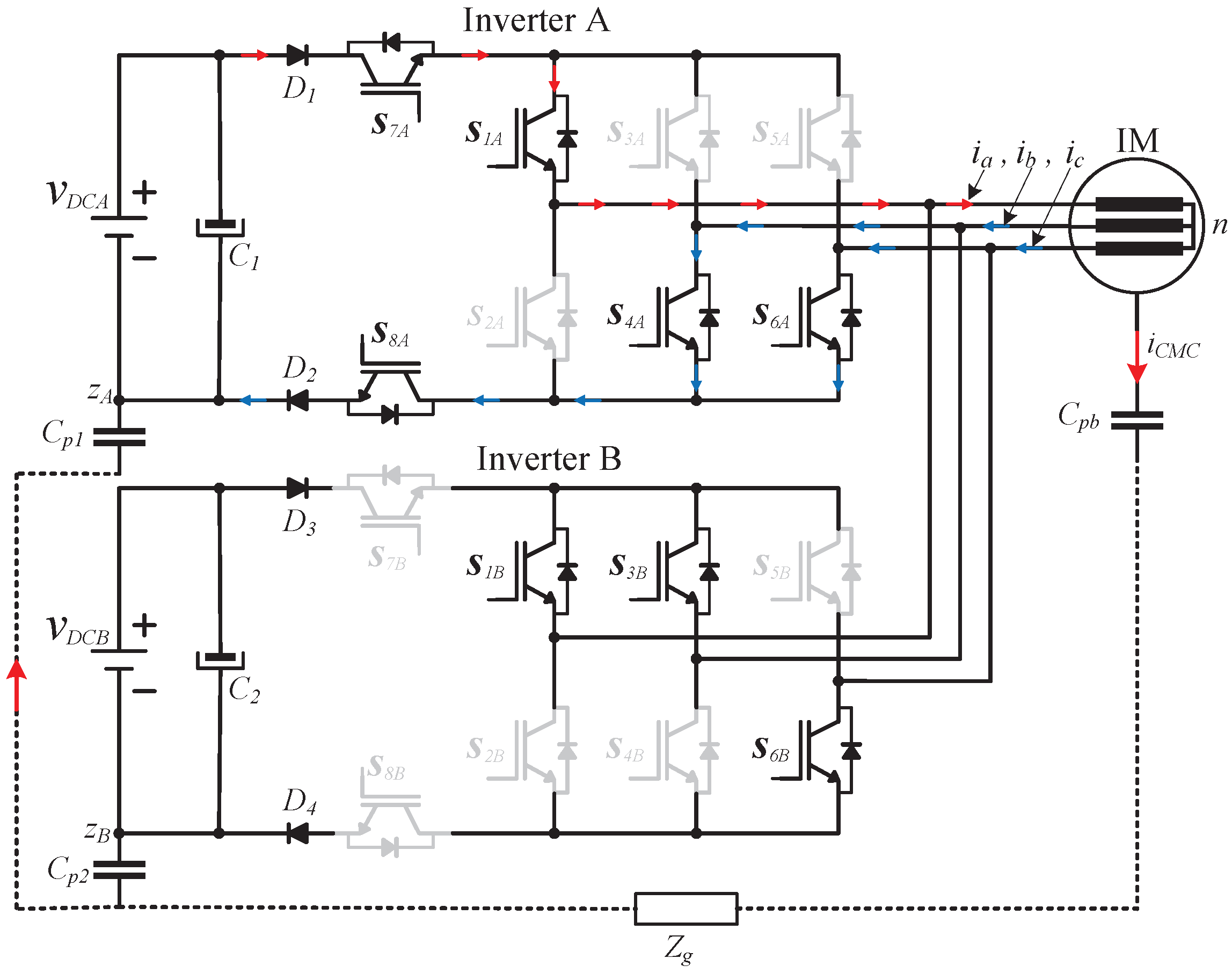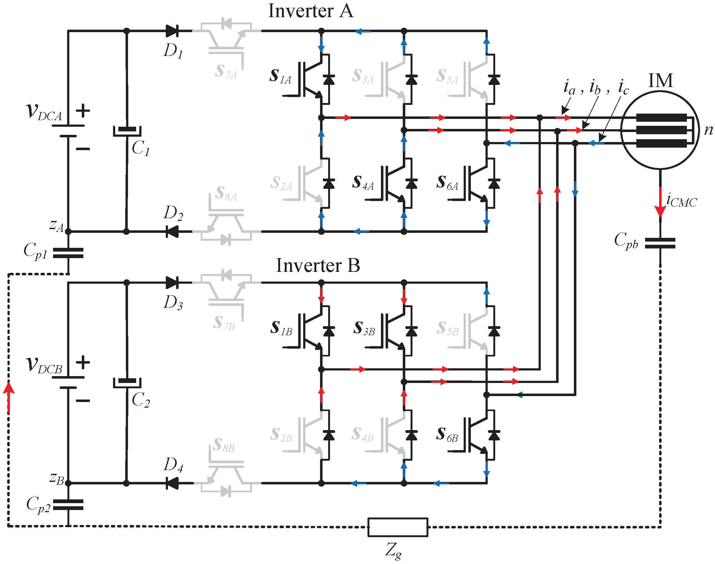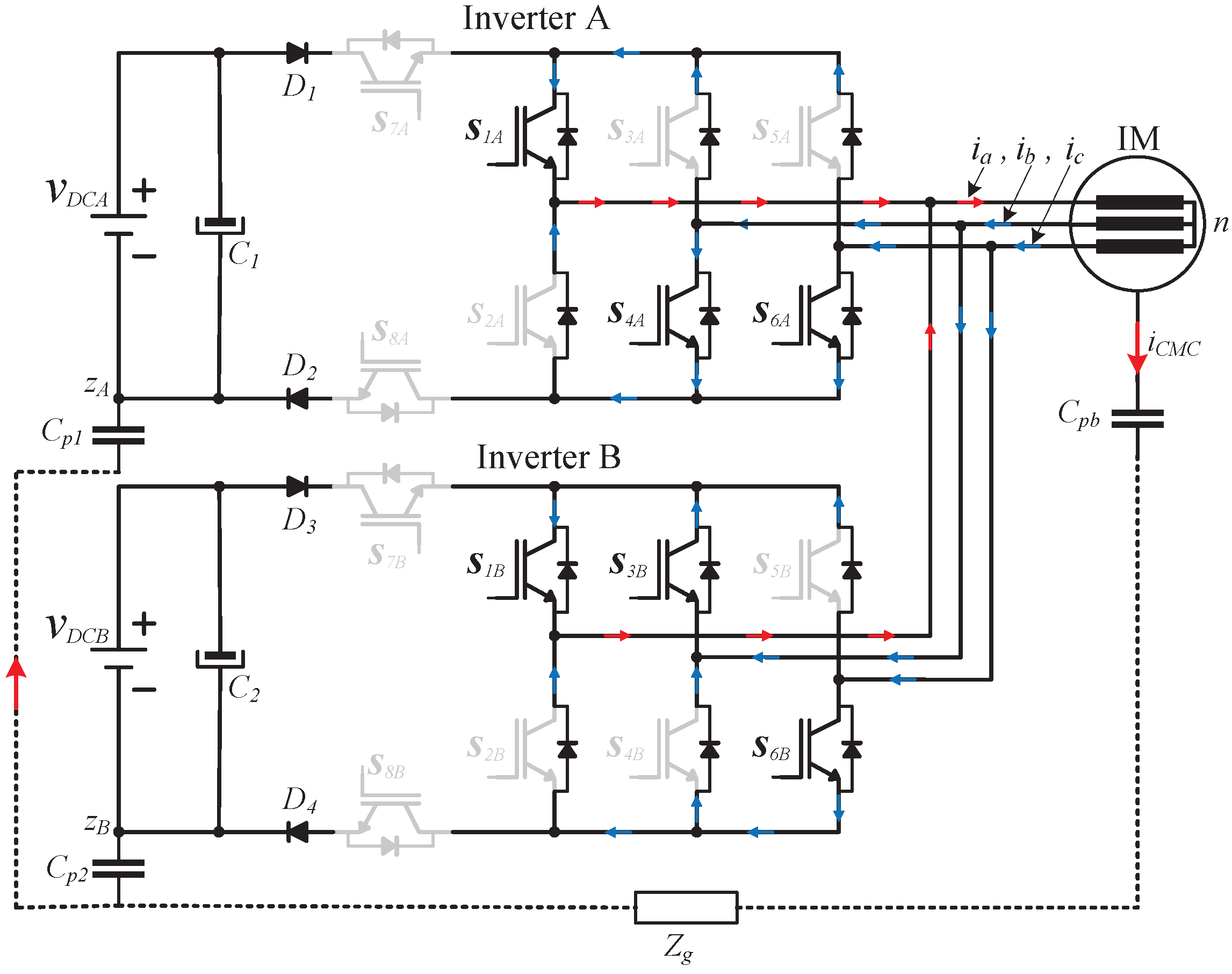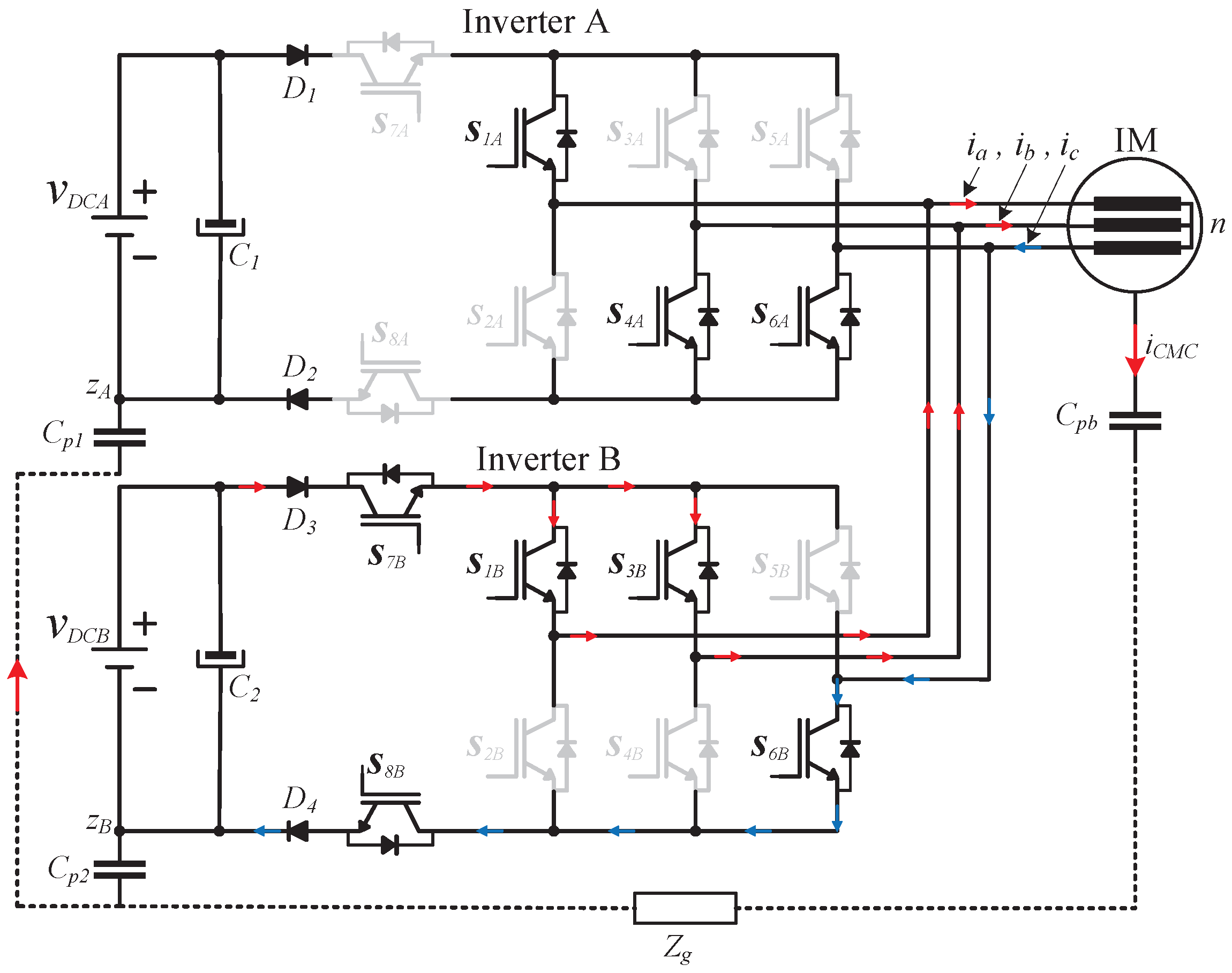 - Zingariello, A.; Zhang, Z.; Griepentrog, G. Evaluation of the Common-Mode Current Propagation Paths in Motor Drive Systems. In Proceedings of the 2024 IEEE 9th Southern Power Electronics Conference (SPEC), Brisbane, Australia, 2–5 December 2024; pp. 1–6. [Google Scholar] [CrossRef]