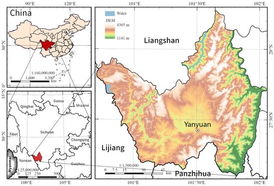 Yanyuan County, part of the Liangshan Yi Autonomous Prefecture in Sichuan Province, China, is situated on the southeastern edge of the Qinghai–Tibet Plateau, along the west bank of the lower Yalong River. Its geographical coordinates extend from 100°42′ E to 102°04′ E longitude and from 27°06′ N to 28°17′ N latitude (Figure 1). The county is characterized by a distinct four-season climate, with an annual frost-free period of 201 days. It experiences minor annual but significant daily temperature variations, with an average yearly temperature of 12.1 °C, peaking at 30.7 °C and dropping to a minimum of −11.3 °C. Winters and springs are typically dry, while summers and autumns see concentrated rainfall, averaging 855.2 mm annually. The region faces simultaneous hot and rainy seasons with extended sunshine durations. The annual evaporation rate, three to six times that of precipitation, highlights notable discrepancies between water availability and thermal conditions [24]. The vegetation in the study area is highly flammable, primarily due to the dominance of Pinus yunnanensis, which covers over 40% of the forest and produces litter that is both highly combustible and slow to decompose [25].