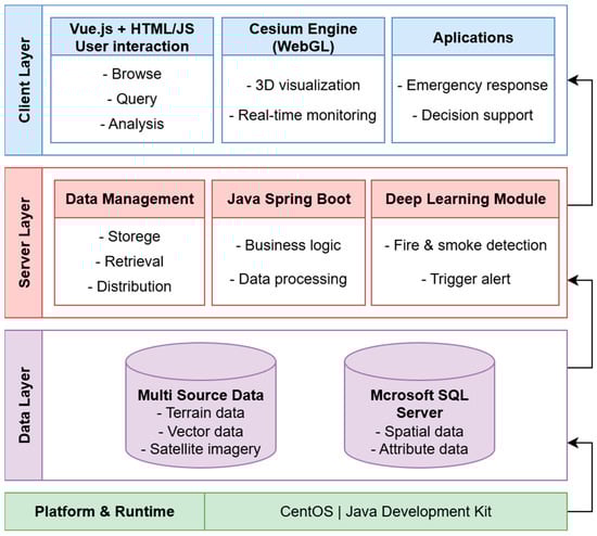 The development of forest fire decision support systems has traditionally relied on conventional C/S or 2D B/S architectures, which often lack spatial depth, real-time integration, and broad accessibility [15,16,20]. This study presents a novel Web-GIS 3D visualization system that integrates multi-source geospatial data, real-time video monitoring, and deep learning–based fire detection within a browser-based, cross-platform framework. The system marks a departure from traditional approaches and introduces several conceptual, technical, and practical advancements.