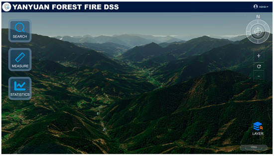 The system’s architecture is categorized into three primary layers as per the layered design principle: the Data layer, Service layer, and User layer. The data layer forms the base, tasked with storing critical data such as 3D terrain, raster images, and spatial vectors, organized within the file system to serve as a data source for the Web server. It also enables data updates, deletions, and other management functions. The service layer, functioning as the system’s nucleus, manages and processes spatial information, encompassing tasks like data storage, organization, distribution, retrieval, and processing, thereby ensuring efficient and reliable data handling. At the apex is the user layer, primarily comprising browser applications, offering an intuitive and visual interaction environment. Users engage with the system through this layer, executing various functions including query, analysis, monitoring, and emergency response. This layer’s design focuses on user-friendliness and accessibility, facilitating efficient use by individuals of varying technical expertise. Collectively, this layered architecture not only streamlines data management and processing but also boosts the system’s adaptability and scalability, equipping it to meet the dynamic demands of forest fire prevention management (Figure 3).