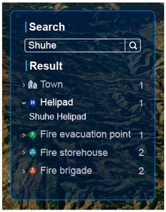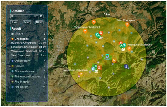 In the context of forest fire emergencies, the proximity search function is a key feature for rapidly accessing essential information. This function enables users to swiftly locate and acquire contact details of the nearest fire stations, fire monitoring towers, and other crucial facilities, thereby aiding in immediate response (Figure 8).