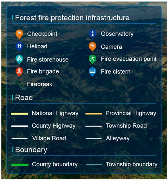 The vector data employed in this research encompass basic geographic data, forest resource data, and specialized data for forest fire prevention. The basic geographic data include elements such as administrative boundaries, roads, rivers, and settlements. Forest resource data comprise field survey information like species of trees, age of trees, and characteristics of forest stands. The thematic data for forest fire prevention detail locations of fire prevention and suppression facilities within the study area, including checkpoints, fire evacuation point, fire storehouse, fire cistern, and camera surveillance systems (Table 1).