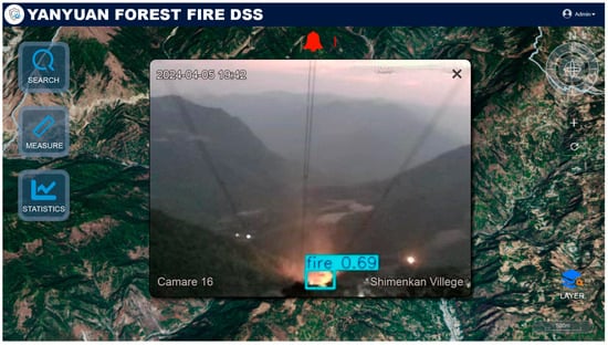 On the reserved test set, which included complex scenarios reflecting the terrain and vegetation of Yanyuan County, the model achieved an precision of 82.4% and a recall of 73.7%, indicating strong reliability for early fire warning. The model was deployed on a central server equipped with an NVIDIA RTX 4070 Ti SUPER GPU, where it processed video streams at an average rate of 25 FPS per stream, effectively supporting real-time analysis across multiple video feeds. This server-side deployment strategy facilitates system maintenance while ensuring stable and reliable performance (Figure 11).