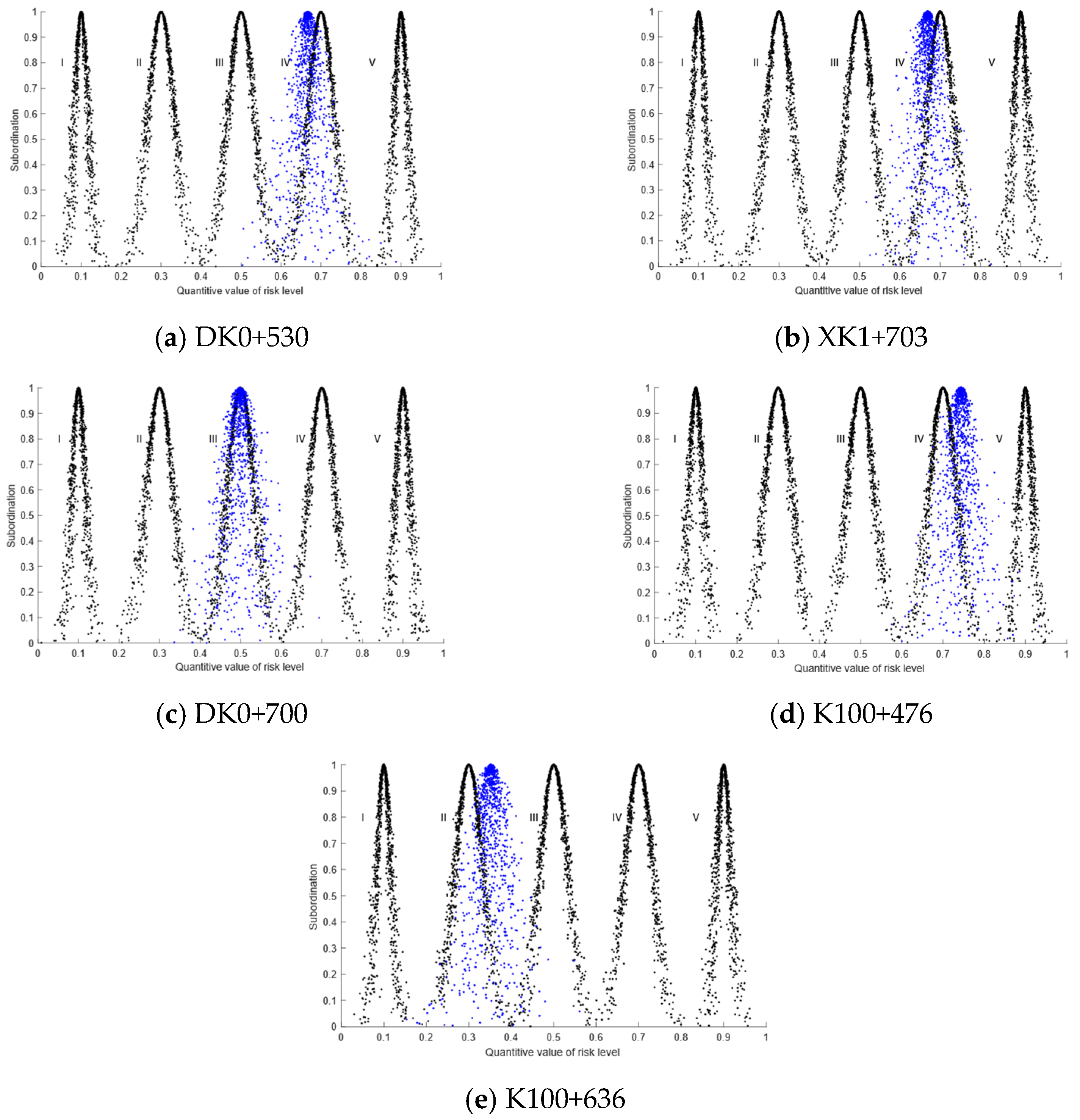 According to the “Railway Tunnel Design Specifications” (TB10003-2016) [28] and the “Regulations on Risk Assessment and Management of Railway Tunnels” in China, as well as existing research findings on tunnel risk assessment, and based on the classification of tunnel water inrush risk indicators in [29], the tunnel water and mud inrush risk indicators are categorized into five risk levels: low risk (I), relatively low risk (II), moderate risk (III), high risk (IV), and extremely high risk (V). The classification and representation of risk levels are shown in Table 1.