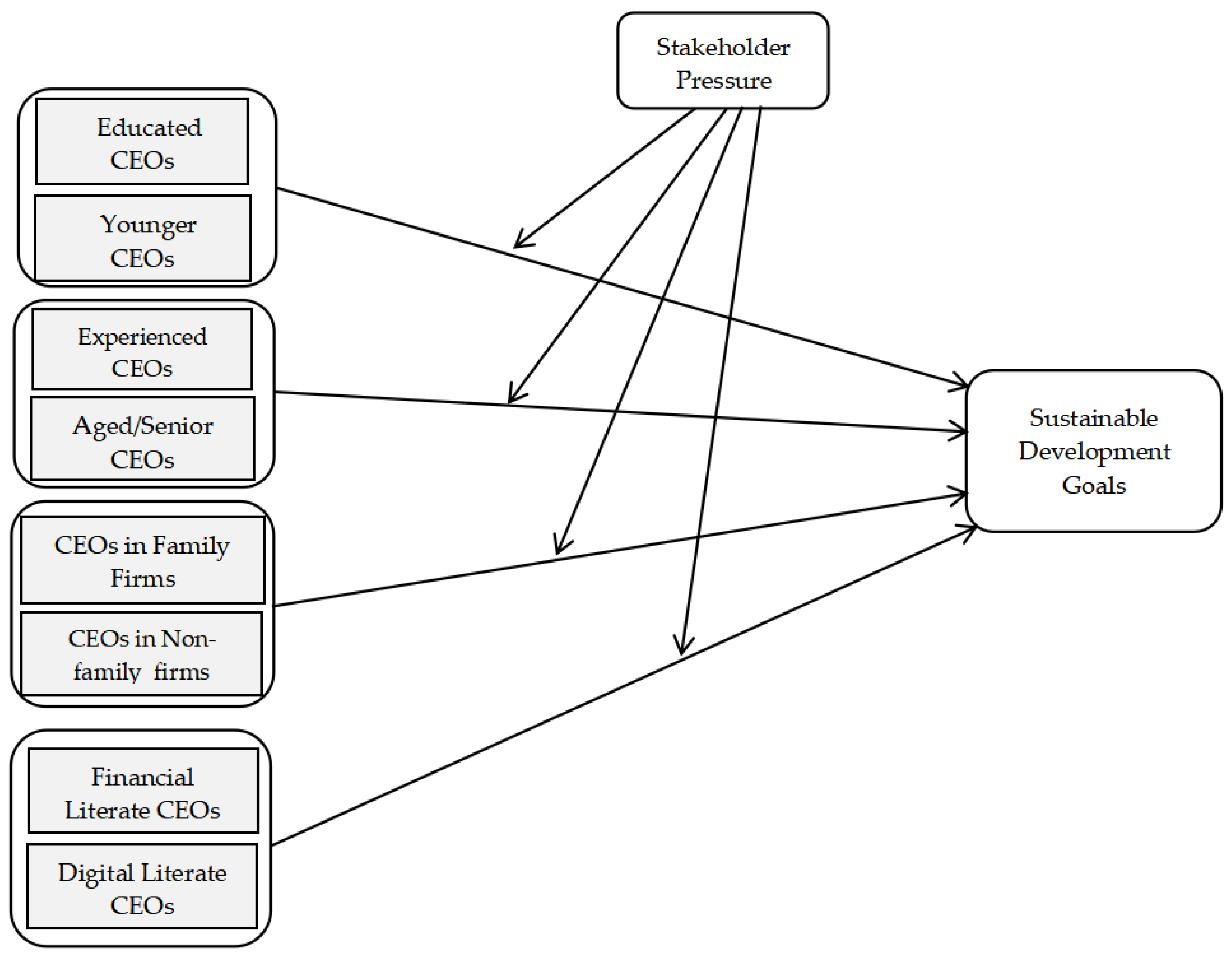 3]. This study specifically investigates how different attributes of CEOs can influence an organization’s participation in SDGs, while also considering the crucial role of external pressures.