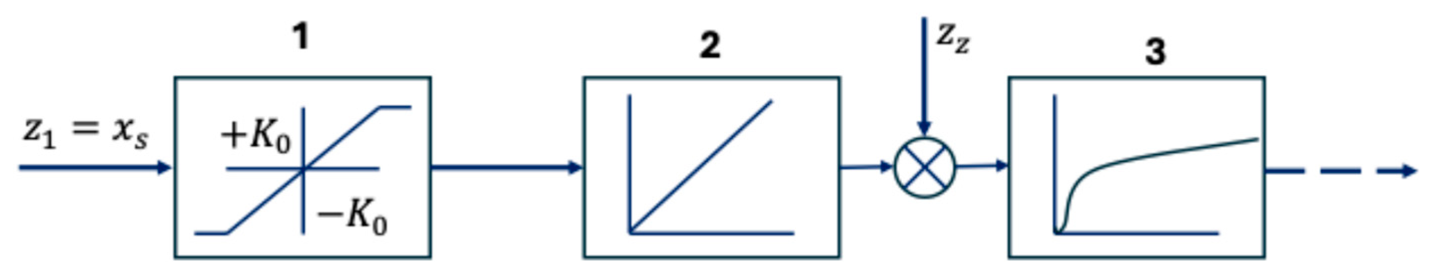 Figure 1. System control block diagram. 1—limiter; 2—servomotor; 3—controlled object; z 1 —disturbing influence; z z —reference influence; x s —control variable (sum of all influences on the limiting link).