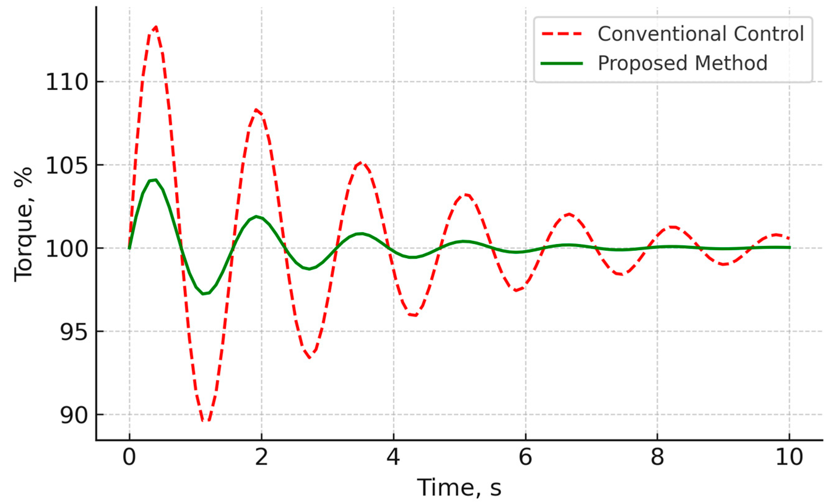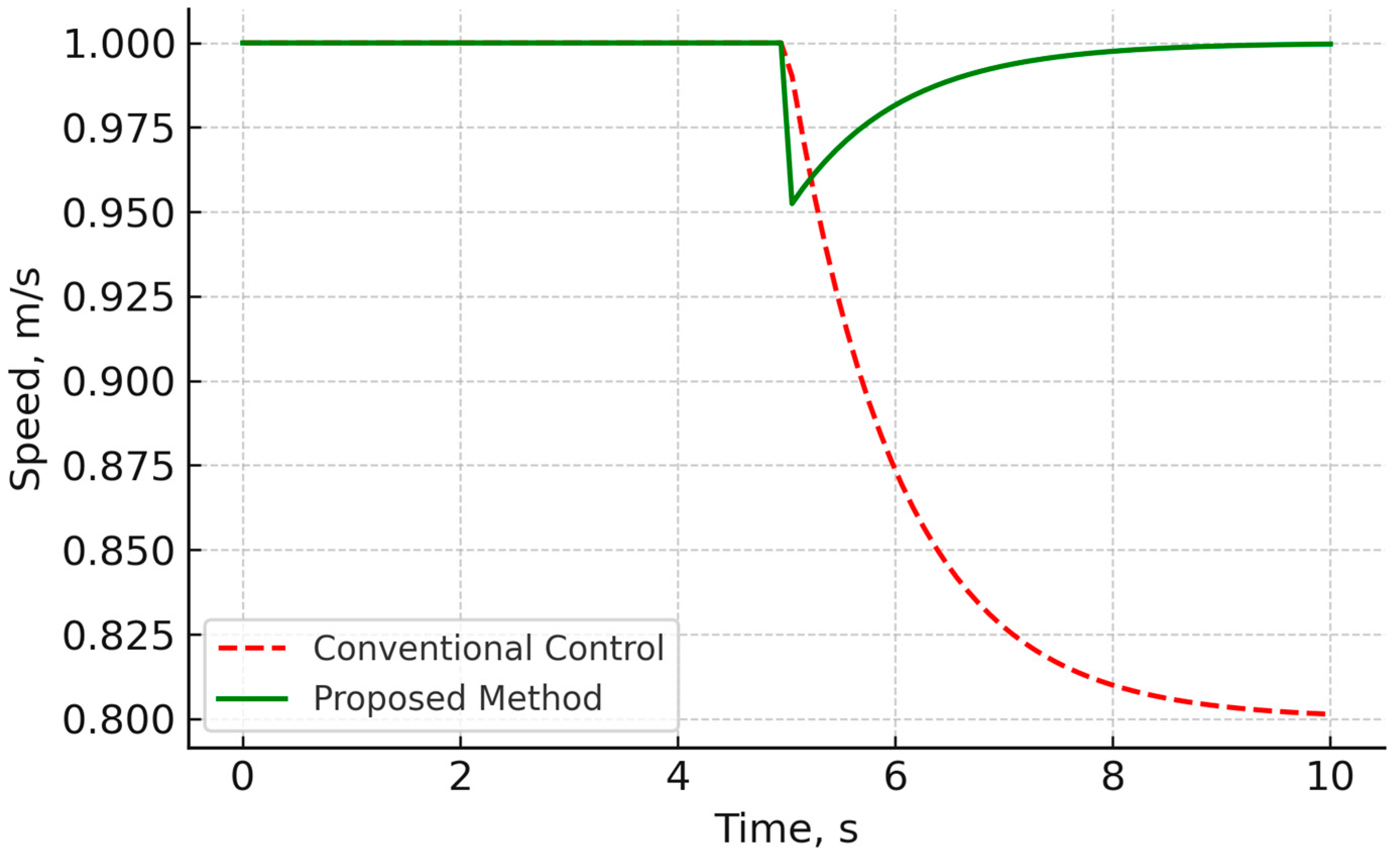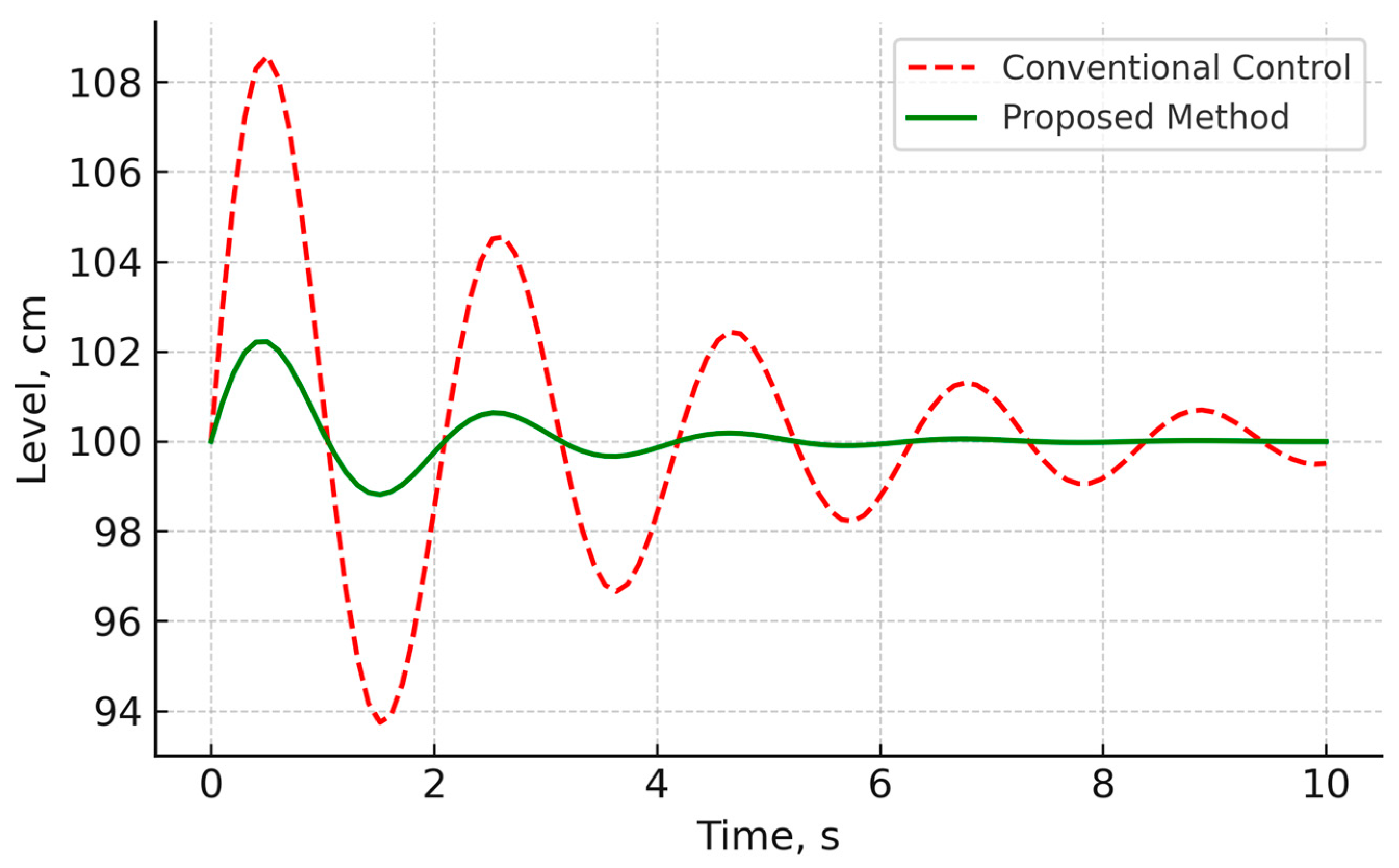 Recent studies confirm that substantial progress in improving transient performance and advancing sustainability outcomes has been achieved through a variety of methods. Model Predictive Control (MPC) strategies, for instance, have demonstrated clear potential to reduce overshoot and enhance robustness under nonlinear and constrained conditions [27,28]. Reinforcement learning (RL) approaches also exhibit strong adaptability to dynamic environments, though their reliance on extensive training data and high computational demands often limits their feasibility for large-scale or real-time industrial applications [31,32]. In parallel, modified PID algorithms, such as SDP-PID+, have been reported to improve stability and control accuracy in systems with significant delays [33]. These approaches have undoubtedly advanced the state of the art; however, they frequently require sophisticated computational infrastructures, complex parameter tuning, or bespoke implementation strategies that hinder straightforward adoption in industrial automation. Against this backdrop, our study provides a distinct contribution by achieving comparable performance improvements through the use of standard industrial regulators. This ensures not only analytical rigor but also practical feasibility, which is particularly critical for sustainable development in large-scale production and transport systems.